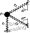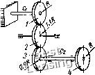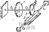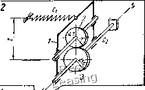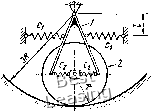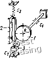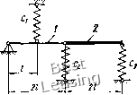 Определим теперь амплитуды изменения обобщенных координат, скорости и ускорения при резонансе Ф1(Р-*) = /г/2«* = 0.271/(2-2,55- 10,2)=0,00521 рад; ир*. = Фшах = 0.0531 с-; ф. = = Z" = (0,271 • 10,2)/(2 • 2,55) = 0,542 с Из вычислений следует, что амплитуды изменения обобщенной координаты и ускорения при резонансе {p = k) весьма близки к максимальным значениям. Задание Д-25. Исследование свободных колебаний механической системы с двумя степенями свободы Определить частоты малых свободных колебаний и формы главных колебаний системы с двумя степенями свободы, пренебрегая силами сопротивления, массами пружин и моментами инерции скручиваемых валов. Схемы .механических систем тел 1 - 3 в положении покоя показаны на рис. 248 - 250, а необходи.мые для решения данные приведены в табл. 64. Примечание. Во все.х вариаитах колеса считать сплошными однородными дисками, стерж1Н!- тонкими однородными. Во всех случаях качение колес происходит без скольжении. Пример выполнения задания. Определить частоты свободных колебаний и найти формы главных колебаний системы с двумя степенями свободы, указанной на рис. 251. Дано: /i = 20cm; 4 = 60 см; /з = 30см; масса груза = 0,5 кг; масса однородного стержня ED т2 = 3 кг; коэффициенты жесткости пружин: Cj = 60 Н/см; с.2 = 40 Н/см; Сз = 40 Н/см. Решение. Система состоит из груза В, подвешенного к рычагу ED на пружине с коэффициентом жесткости с. В точках Е \\ D рычаг опирается на пружины с коэффициентами жесткости fj и с. В состоянии покоя рычаг занимает горизонтальное положение. Пружины с коэффициентами жесткости q и деформированы (сжаты или растянуты) соответственно на величины /сп, /ста- Пружина с коэффициентом жесткости растянута на величину /„э- За обобщенные координаты примем: г -вертикальное смещение груза от положения покоя; ср -угол поворота рычага ED от положения покоя. На рис. 252 показано положение системы при положительных обобщенных координатах. Найдем кинетическую и потенциальную энергии системы. Кинетическая энергия системы состоит нз кинетической энергии груза и кинетической энергии рычага r = (l/2).mi2 + (l/2)-W. где 7, ф -обобщенные скорости; У -момент инерции стержня ED относительно оси вращения О. /.5/ I 051 Сз "Ж Cz ![]() ![]() fvwwv4