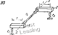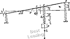 с, fj 31 ![]() \60° 30 ![]() ![]() ![]() Момент инерции где / - длина стержня ED, равная 80 см; d = OC -расстояние от центра тяжести С стержня до оси вращения О (рис. 252) d = (/ + 4)/2 - /j = (/2 - /i)/2 = (60 - 20)/2 = 20 c.\i. Момент инерции стержня Jo = (3 • 80)/12 + 3 • 20 = 2800 кгсм = 0,28 кгм Потенциальная энергия системы равна работе сил при перемещении системы из отклоненного положения в нулевое (положение статического равновесия). Рис. 251 ![]() Рис. 252 Поте1Щиальную энергию системы вычислим как сумму: где Я1 - потенциальная энергия груза н рычага в поле сил тяжести; Ли - поте[щиальная энергия деформированных пружин. Так как h = OC-(p=--(p, то Л1=-С1г + С.,Ф. Таблица 64