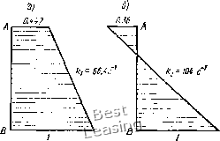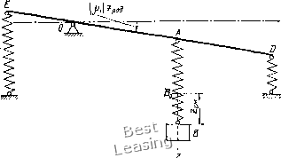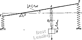 Коэффициенты распределения, соогветствующие частотам и / в общем случае имеют вид Cl2-121 Ci2-aj21 c,2 -а,2Й C22 -022*3 В данном случа е Pj- (4000-0,5-4414)/1200 = - 1,49 рад/м = - 0.0149 рад/см; и2 = -(4000-0,5-10870)/1200= 1.2 рад/м = 0,0120 рад/см. Первое главное нопе5ание системы кг 6S.4C; JJ,= -0,0149рад/ск ![]() Второе гпадиое колебание системы К2= 104 с-: Л2= о, 012рад/см ![]() Рис 253 Уравнения, определяющие первое главное колебание, прим; следующий вид; = Л, sin (66,4/ +Pi); ф, - - 0,0149Л, sin (66,4/ H-Pi). Уравнения, определяющие второе главное колебание: га = /1,01 (104/+ Pi); ф.---0,0122 sin (104/+ р2). ![]() Рис 254 Общее решение дифференциальных уравнений представляет собой сумму частных решений: 2 = 2i + 22 = Л, sin (66,4/ + Pi) + А, sin (104/ + Pa); <Р = Ф1 + Фг = - 0.01491 siп (66,4/ + Pi) + 0,012Л2 sin (104/ + р)- Значения Л( и Р( определяются по начальным условиям задачи. Коэффициенты распределения Pi и Рз показывают, что в первом главном колебании с частотой fti = 66,4c пepeмeнJ,eнию груза вниз, равному 1 см, соответствует поворот рычага по вращению часовой стрелки иаугол, равный 0,0149 рад (рис. 253, а); во втором главном колебании с частотой 2= 104 с 1 тому же перемещению груза вниз на 1 см соответствует поворот рычага против вращения часовой стрелки на 0,0120 рад (рис. 253, б). Формы колебаний можно представить в виде графиков. Для рассматриваемой задачи построим график сравнения перемещения груза В и точки А (точки прикрепления пружины к рычагу). В первом главном колебании при перемещении груза В вниз на 1 см точка А перемещается также вниз на величину Pi/,, = 0,0149 х х30 = 0,447 см (точки В н А находятся в одной фазе) (рис. 254, а). Во втором главном колебании при перемещении груза В вниз на 1 см точка А перемещается вверх на величину 23 = 0,012 х X30 = 0,36 см (точки В и А находятся в противоположных фазах) (рис. 254, б). Задание Д-26. Исследование вынужденных колебаний механической системы с двумя степенями свободы Механическая система с двумя степенями свободы находится гюд действием силового гармонического возмущения в виде силы Р = = P„cos pt или момента Mncos pt. Пренебрегая сопротивлением, исследовать вынужденные колебания системы. Схемы механических систем в положении покоя показаны на рис. 248 - 250. Необходимые сведения об инерционных и упругих свойствах системы, а также ее размеры приведены в табл. 64. Массами пружин и скручиваемых валов пренебречь. В табл. 65 указано, к какому нз тел системы приложена возмущающая сила Р или пара сил с моментом М. Линия де11ствия силы Р во всех случаях проходит через центр тяжести тела, к которому она приложена. В процессе колебаний линия действия силы остается либо вертикальной, либо горизонтальной (см. табл. 65). Таблица 65