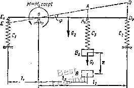 по закону: М = Ма cos pt. Дано: массы элементов системы = 0,5, = 3 кг, коэффицпенты жесткости пружин Ci = 60, С2 = 40, Сз = 40 Н/см; линейные размеры: /i = 20, /2 = 60. 4 = 30 см. Угол поворота стержня DE под действием пары сил с постоянным моментом М = Мо равен: фо = 0,01 рад. Решение. За обобщенные координаты примем; г -вертикальное смен1ение груза от положения покоя и ф -угол поворота рычага DE от положения покоя. ![]() Рис. 255 На рнс. 255 пунктиром показано положение системы при положительных обобнтенных координатах. Уравнения Лагранжа для рассматриваемой системы имеют вид: d 1дТ\ дТ дП . 1<Т\ дТ г п /п dt \ di где Qz и Q;p - обобщенные возмущающие силы. Выражения для кинетической и потенциальной энергии получены в примере к заданию Д-25, где исследовались свободные колебания рассматриваемой системы. Г = (1 /2) • a,,z + fli22cp + (1 /2). а22Ф; 1 П = (1/2) • с„г + с,2гф + (1/2) • С22Ф-, где щ/ и с,/- коэффициенты инерции и жесткости системы, равные aii = mi = 0,5 кг, ai2 = 0, 022 =/0 = 0-28 кгм; Сц = Сз = 4000 Н/м. Ci2 = С21 = Сзз = 1200 Н; C22 = Ci/ + C2/. + C3/i = 2040 Нм. Частоты свободных колебаний и соответствующие коэффициенты распределения получены в примере к заданию Д-25 1 = 66,4 с 1; Pi = - 1,49 рад/м; 1 . /22=104 с-1; На =1,2 рад/м. j Определим обобщенные силы и Q, связанные с действием возмущающего момента: Q,=6AmJ62; Q = &A„/6(f, (4) где бЛд, - элементарная {забота возмущающего момента на перемещении системы, вызванном элементарным приращением обобщенной координаты 2 при ф = const; бЛд,- элементарная работа возмуи1аю-щего момента на перемещении системы, вызванном элементарным приращением обобщенной координаты ф при z = const; 62, бф-элементарные приращения обобщенных координат. Если принять направление возмущающего момента при / = 0 положительным и считать, что оно совпадает с направлением отсчета положительных значений угла ф, то из соотношешп"! (4) получаем: = 0; = Мо cos pt. Следовательно, ди4)4>еренциал!.ные уравнения (I), описывающие вынужденные колебания системы в обобщенных координатах г и ф, имеют вид: ал" + С1,2Н-с,2ф = 0; аф + Ciz + сЦ! = Mq cos pt. (5) Частное решение системы дифференциаль[п>1х уравнений (5), определяющее вынужденные колебания, находим в виде: z = cos pt, ф = ЛфCOspЛ Подставляя эти выражения в дифференциальные уравнения (5), получаем: (сц-ацр") Л. + с,,Лф = 0; CiiA + ic.n - anP-) А-= М„. Из этой системы двух алгебраических уравнений относительно Л и Лф находим: Д :2 . /сч А = 0(11-ДцР) /74 Амплитуды вынужденных колебаний равны абсолютным значениям А, и Лф. Воспользуемся формулой (7) для определения амплитуды возмущающего момента. По условию задачи при р = 0 угол поворота стержня DE равен (fo, следовательно, при р = 0 Лtfo = Фо = Vn/(CiiC2.i - cii), откуда Мо = Фо с,2 - -J) = 0,01 (2040 - ) = 16.8 Нм. Леремеи1ение груза под действием постоянного момента М = Мо, приложенного к стержню DE, можно найти из соотношения (6) при р = 0: А Z - 6,8-1200 Л.-о-2о- спСп-съ ~~ 4000-2040-1200= ~ " Так как знаменатель в формулах (6) и (7) является квадратным многочленом относительно р, а корнями этого многочлена являются квадраты частот свободных колебаний системы k\ и .j, то формулы (6) и (7) можно представить в виде лЛ2 144000 Az = (p2-44l4) (p2-10870) Л(Г) - Mq (Сц-ЧцР-) 120 (4000 0.5p2) anaz2 (p~kV)(p~ki) (p2- 4414) (p2--10870) () Формулы (6), (7) или (8), (9) позволяют проследить за зависимостью Л; и Лф от частоты р и построить соответствующие графики (рис. 256). COJ - 0.01