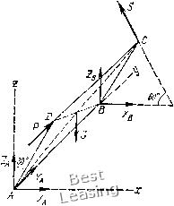 Пример выполнения задания. Дано: рама ABCD весом 0=1 кН; Я = 2 кН; ЯМ ; AD = ВС = 60 см; ЛА = CD =100 см; а = 30°; р = 60 (рнс. 60). Нантн и Rn (Л -шаровой шарнир, fl -петля). Решение. Рассмотрим равновесие сил, приложенных к раме: силы тяжести С, силы Р, реакции S стержня СЕ и составляющих реакций оиор А и В: Ха, Уд. а, Хц, (рис. 61). Прежде всего ![]()