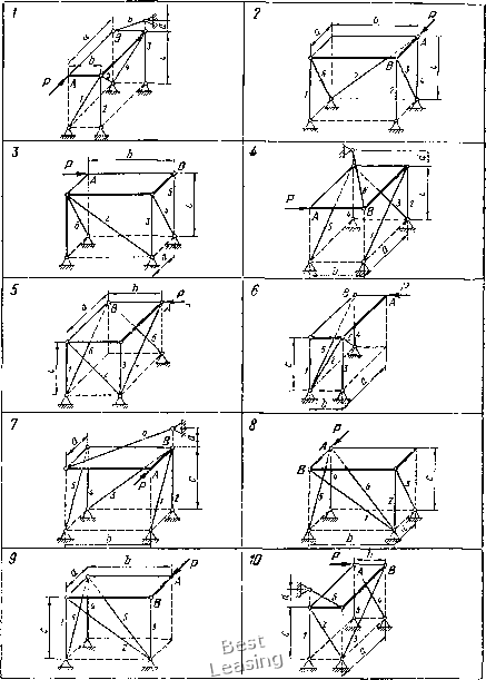 ![]() Рис. 60 Рис G1 составим уравнение моментов сил относительно оси, проходящей через точки Л и В: = 0; G (fiC/2) sin 30° - 5 ВС • sin 60° = 0. откуда S = (G • sin 30°)/(2 • sin 60°) = (1 • 0,5)/(2 • 0,866) = 0,289 кН. Затем составим уравнения моментов сил относительно координатных осей Ах и Аг\ 2.W,.v = 0; -P-AD cos 30" - G • ЛВ/2 + 5 cos 30° • Л В + • ЛВ = 0; Z« = Р • /ID cos 30° + G/15/2- 5 cos Ж AB AB 2-60-0,866+ 1 -50-0,289-0,866- 100 , .q u - Щ - i.y kh; Mu = 0; P-AD sin 30° + S cos 60° • AB-Xq - Л В = 0; V P-ADsm30° + Scos&(yAB 2 - 60 0,5 + 0,289 - 0,5 - 100 „ Ад =----Щ-= 0,744 kH. Наконец, составим уравнения проекций сит иа осп координат: IX, в- Хл + Х-соьбОгО; Хд = - Хп + S cos 60" = 0,74 I -1- (),289 • 0,5 = - 0,6 кН; 1Г; = 0; Гд + Р = 0; Гл = --Р--= -2 кН. ZZ, = 0; 7и-С + 7„-!-5соьЗО-0. Z.4 = G-Zi.-Sc()s30" = 1 - 1,29-0,289-0,860 = - 0,54 кН. Итак, реакции всех связей рассматриваемой конструкции определены. Задание С-11. Определение роакций стержней, 110ддсря;пиа101цн.\ нрялюуго.чьную млпту Найти реакции стержней, потдер/кппаютпх тоик\ю горизопталь-liym однор-одн)ю илич у весом G, npi деист сии иа нее вдо.7ь стороны АВ силы Р. Схемы коисгручцнй показаны на рис. 62 - 64; необходимые для расчета данные приведены в табл. 17. Т п б л и ц <1 17
