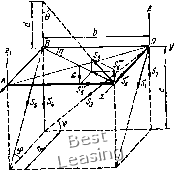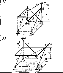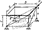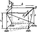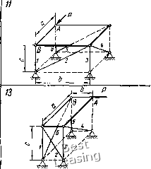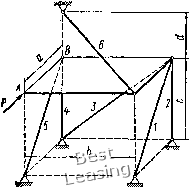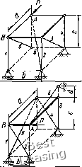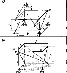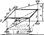 ![]() 3» гая, что все стержни растянуты, направляем их реакции 5,, S, S3, S4, 5б, Se от узлов. Выбираем оси координат Oxyz так, чтобы эти оси пересекали наибольшее количество стержней. В этом случае уравнения равновесия получают наиболее простой вил. Дополним построение до прямоугольного параллелепипеда и введем углы (р, if, г\, Ь. Усилие ![]() ![]() Рис. 65 Рис. 66 целесообразно разложить на три составляющих по координатным осям (см. рнс. 66); их модули: SH = SeSinesinTi; S6 = SeSinecosTi; Sr = SeCOse. Составляем шесть уравнений равновесия: 2Мь = 0; G-bl2 + S,b + Sf,s\nif-b = Q- (1) 2УИ,, = 0; С-а/2-5Га = 0; (2) SyW,-, = 0; -ЯЬ + 55СО8ф-й-5ба = 0; (3) 2А:, = 0; -Я + 51С08ф + 55С05ф-5б = 0; (4) 2У, = 0; -5зСО5г)-5б=0; (5) 22, = П; -0-5181пф-52-5з5пгз-4-5б8тф + 5Г = 0. (6) По заданным размерам вычисляем синусы и косинусы углов. с 4 ! sin ф = cos ф = sin г) = соь it- = \ ."-f 42 T 4Г 1/41 0 1 2 3 4 5 6 7 8 9 10 11 12 13 14 15 16 17 18 19 20 [ 21 ] 22 23 24 25 26 27 28 29 30 31 32 33 34 35 36 37 38 39 40 41 42 43 44 45 46 47 48 49 50 51 52 53 54 55 56 57 58 59 60 61 62 63 64 65 66 67 68 69 70 71 72 73 74 75 76 77 78 79 80 81 82 83 84 85 86 87 88 89 90 91 92 93 94 95 96 97 98 99 100 101 102 103 104 105 106 107 108 109 110 111 112 113 114 115 116 117 118 119 120 121 122 123 124 125 126 127 128 129 |
