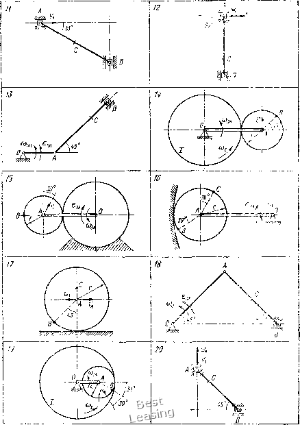CP = Kl5* + 252 4-2-15-25.0,5 = 35,0 см. Следовательно, скорость точки С: Ус = О) СЯ = 3,86 • 35,0 = 135 см/с. Вектор vc направлен перпендикулярно к ЯС в сторону вращения колеса. Задание К-5. Определение скоростей и ускорений точек твердого тела при плоском движении Найти для заданного положения механизма скорости и ускорения точек В н С. Схемы механизмов помещены на рис. 90 - 92, а необходимые для расчета данные приведены в табл. 31. Таблица 31