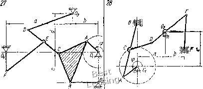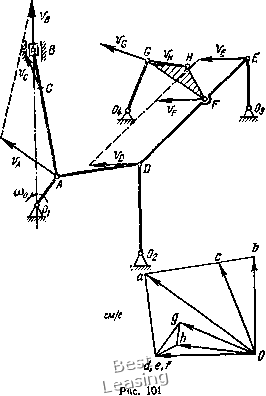 Продолжая построение плана скоростей, находим скорости точек D, Е, F, G ч Н (табл. 35). На чертеже механизма концы векторов скоростей точек прямолинейного звена (например. А, В, С или D, Е, F) находятся на одной прямой. б) Определение угловых скоростей звеньев механизма. Отрезок аЬ плана скоростей выражает вращательную скорость точки В вокруг точки Л: аЬ = ил/! = Шло-ЛД, отсюда угловая скорость звена АВ ..\4й = а&/4В= 19.5/46 = 0,-124 с Аналогично определяем угловые счоростн звеньев Л О, DE, FGH: о)до = ай!/ЛО= 14,5/29 = 0,5 с"; Мое = delDE = 0/DE = 0; (ган = fg/PG = 8,8/25 = 0,272 с-. Угловую скорость w/o/f можно определить и следующим образом: Угловая скорость звена OD определяется по вращательной скорости точки D вокруг неподвижного центра Оа wo.D = 10/020= 17,5/32 = 0,547 с->. Аналогично определяем угловые скорости звеньев ОЕ, 00; «о.£ = У£/Оа£= 17,5/18 = 0,972 с-; -0.0 = =- = 0,740 0 1 2 3 4 5 6 7 8 9 10 11 12 13 14 15 16 17 18 19 20 21 22 23 24 25 26 27 28 29 30 31 32 33 34 35 [ 36 ] 37 38 39 40 41 42 43 44 45 46 47 48 49 50 51 52 53 54 55 56 57 58 59 60 61 62 63 64 65 66 67 68 69 70 71 72 73 74 75 76 77 78 79 80 81 82 83 84 85 86 87 88 89 90 91 92 93 94 95 96 97 98 99 100 101 102 103 104 105 106 107 108 109 110 111 112 113 114 115 116 117 118 119 120 121 122 123 124 125 126 127 128 129 |