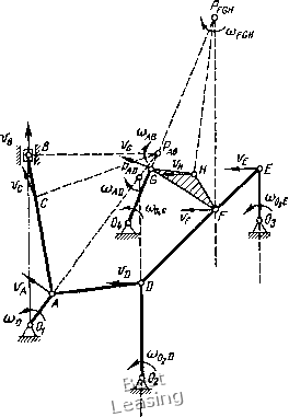 Полученные угловые скорости звеньев механизма сведе1гы втабл, 36. 2. Определение скоростей точек и угловых скоростей звеньев механизма при помощи мгновенных центров скоростей. ![]() Рис. 102 а) Определен lie положения мгновенных центров скоростей звеньев механизма. Строим механизм в выбранном масштабе (рис. 102). Звенья ОА, OD, ОЕ, O4G вращаются вокруг неподвижных центров О,, Оа, О3, О4. Мгновенный центр скоростей Рав звена АВ находится как точка пересечения перпендикуляров, проведенных из точек Л и Б к их скоростям. Аналогично определяется положение мгновенных центров скоростей Pad и Pfgh- Мгновенный центр скоростей звена DE находится в бесконечности. б) Определение скоростей точек. Скорость точки А va = oiQ-0,A = 2[2 = 2i см/с. Скорости точек звена Л В пропорциональны расстояниям от точек до мгновенного центра скоростей Ран- vaIvb = РавА/РавВ; v/vc = РавА/РавС Расстояния от точек до мгновенного центра скоростей измеряются на чертеже. Пользуясь масштабом длин, получаем; ЯдвЛ = 57см; РдвВ = 41см; ЯлдС = 41,5см. Определяем скорости точек S и С: vb=-va- РавВ/РавА = 24.41/57 = 17,3 см/с; vc = va- PabQPabA = 24 • 41,5/57 = 17,5 см/с. Для определения скорости точки D воспользуемся пропорцией ka/vdPadA/PadD; vd = va-PadD/PadA = 24 • 34,5/47,5 = 17,4 см/с. Так как мгновенный центр скоростей звена DE находится в бесконечности, то vf, = vr=vd=\lA см/с. Для определения скоростей точек G и Н имеем следующие пропорции: vf/va = РгаиР/РнацС; vr/v„ = PfqhPIPfoiiH, отсюда Уо = уЯтояС/Ягая = 17,4-52,8/62,7= 14,6 см/с; = У/г •Р/гоя /Ргая= 17,4-50,8/62,7= 14,1 см/с. Полученные скорости приведены в табл. 35. Одновременно с определением модулей скоростей точек находим их направления, а также направления вращений звеньев механизма. Например, по направлению скорости точки А и положению мгновенного центра скоростей Рав устанавливаем, что вращение звена АВ происходит по часовой стрелке. Поэтому скорость точки В при данном положении механизма направлена вверх. Аналогично определяем направления вращений остальных звеньев и направления скоростей точек механизма (см. рис. 102). в) Определение угловых скоростей звеньев механизма. Скорость любой точки звена равна произведению угловой скорости этого звена на расстояние от точки до мгновенного центра скоростей: va = юлв • РавА = шдп • РлоЛ, отсюда определяем угловые скорости звеньев АВ и AD <ой = У/РлИ = 24/57 = 0,421 с-; «до = va/Рдг.А = 24/47,5 = 0,505 с-. Угловая скорость звена OjD определяется гю скорости точки D ,D = Vo,02D= 17,4/32 = 0,544 с-. Угловая скорость звена DE! при данном положении механизма .равна нулю, так как мгновенный иеитр скоростей звена в этом случае находится в бесконечности: ov.£ =- 0. Аналогично определяем угловые скорости остальных звеньев механизма: соозя = Ve/o,,: = 17,4/18 = 0,967 с-\ oON = VrlPtaiiF - 17,4/62,7 0,278 с (uo,g = VqIO,G== 14,6/20 = 0,730 с \ Полученные угловые скорости приведены в табл. 36. 3. Определение ускорений точек А, В, D* и угловых ускорений звеньев АВ и BD. а) Определение ш, и е,,л (рис. 103). Определяем ускорение точки В при помощи теоремы об ускорениях точек плоской фигуры: Wb = Wa+Wab + wab- Так как кривошип ОА вран1,ается равномерно, то ускорение течки А направлено к центру Oj и равно: Wa -= Wa = О,Л щ -\2 2 = 48 см,с. Центростремительное ускорение точки В во вращательном движении шатуна А В вокруг полю:а А направлено от точки В к точке А и равно: w)iB = AB-mUb = 46• 0,4 = 7,36 см/с. Откладываем от точки В в соответствующем масияабе ускорение полюса Wa- Из Kotnia вектора Wa строим вектор дала, проводя его параллельно В/1. Через конец век