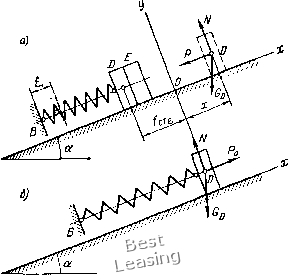 где vXi -сумма проекций па ось х сил, действующих иа груз D (рнс. 146, а): йд -веса, л/- нормальной реакции наклонной плоскости, Я -силы упругости пружины. Такилг образом. Здесь ШцХ = - Gn sin а - Р, Р--=с(х-[„о-1), где /сгд -статическая деформация пружины под действием груза D, £ -перемещение точки прикрепления нижнего конца пружины, происходящее по закону I = d sin/?/(rf = 0,02 м, p-lO с). ![]() Рис. 146 Статическую деформацию пружины найдем из уравнения, соответствую1цего состоянию покоя груза D на наклонной плоскости (рис. 146,6): т. е. откуда VX,--0; -G„sina + Po-О, - G,jsina-f-c-/ct/) = 0, /ciW = G/)Sina/c. Ди4х{)ере1Щпальиое уравнение движения груза D примет вид Шох = - Сл sin а - f (л - /„л - Н) или после преобразования; mnt-1-C.V = cd sin pt. Разделив все члены уравнения Fia /Лд и введя обозггачения cimr, = k-, cdirrin-h, приведем дифференциальное уравнение к следующему виду: x-]-k}x = h sm pt. Решение этого неоднородного уравнения складывается из общего решения х* соответствующего однородного уравнения и частного решения х** данного неоднородного уравнения: х = х* -\- X* *. Общее решение однород1юго уравнения имеет вид Л-* = Cj cos /г/ + Cj sin kt. Частное решение неоднородного уравнения x** = [hl{k-p)\mpt. ОбщнГ! интеграл jt = С, cos fe/ + Са sin fe/ + [/1/(2 - р2)] sm pt. Для определения постоянных интегрирования и найдем, кроме того, уравнение для х: Ji = - Cikswki + Ck cos kt + [hp/ik-p)] cos pt и используем начальные условия задачи. Рассматриваемое движение начинается в момент (/-=0), когда деформация пружины является статической деформацией под действием грузов D и Е. При принятом положении начала отсчета О начальная координата груза D равна Xa = - f„, причем Дг/: = Gp sin а .. = --статическая деформация пружины под действием груза t. Таким образом, при t = О •Vo = -/ст£. Хи = 0. Составим уравнения x = x{t) и x=x{t) для t = 0: х = С{, x = CJihpl(k-p), отк\да С, C, = -hplk{k-p"). Уравнение движения груза D имеет следующий вид: х = - /с.£ cos kt - [hp/k ik-p)] sin kt 4-[h/{k - p2)l sin pt, Найдем числовые значения входящих в уравнение величин: G.-sina 3.9,81.0,5 - -1ГТ0О- - «0245 м; h cd 600 0,02 r. к--р- m,(k-p) ~ 2 (300-100) -" hp 0,03-10 лт-7о T(Pt: = -7;з- = 0073м. Следовательно, уравнение движения груза D: х- -2,45co.s 17 3/- i,73sm 17,3/ + 3sin 10/ (см). Задание Д-i. Исследование относительного движения материальной точки Шарик М, рассматриваемый как материальная точка, перемещается по иил1И1дрическому каналу движуи1егося тела Л (рис. 147-149). Найти уравнение от{ЮС[ггельного движения этого шарика x==f{t), приняв за начало отсчета точку О. Тело А равномерно вращается вокруг неподвижной оси (в вариантах 2, 3, 4, 7, 10, 11, 14, 20, 23, 26 и 30 ось вращения вертикальна, в вариантах 1, 12, 15 и 25 ось враи1еи11я л, горизонтальна). В вариантах 5, 6, 8, 9, 13, 16, 17, 18, 19, 21, 22, 24, 27, 28 и 29 тело А двилсется поступательно, параллельно вертикальной плоскости IJiPZi. Найти также координату х и давление шарика на стенку канала при заданном значении t = x. Данные, нсобходи.мые для выполиспия задания, приведены в табл. 46. В задании приняты следующие обозначения: m - масса шарика М; со - постоянная угловая скорость тела А (в вариантах 1-4, 7, 10- 12, 14, 15, 20, 23, 25, 26, 30) или кривошипов ОВ и (в вариантах 6, 17, 22); с - коэффициент жесткости пружины, к которой прикреплен шарик М; /д - длина недеформироваииой пружины;/ -коэффициент трения скольжения шарика по стенке канала; Ло, Xq - начальная координата и проекция начальной скорости на ось .v. Пример выполнения задания (рис. 150). Даио: а = 30°, (л~лс i; /72 = 0,0] кг; т = 0,2с; лгц = 0,3 м; .vo = 2 м/с, с = 0,01 Н/см=1 Н/м; /о = 0,2 м; /- = 0,2 м Найти уравнение x = x{t) относительного движения шарика М, а также коорд