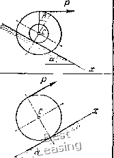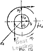 Окружное усилие S можно определить из уравнения (4): 5 = 2 = (Упрх,ф2 + СзГ2 + Mc)lRi\ при = 1 с 29.5 (4.034 1 + 0,4597) + 400 9.81 0,2 + 2000 295 Н ![]() Для определения натяжения нити Т составим дифференциальное 2 уравнение вращения звена 2 (рис. 175) в следующем виде: Jx,<h = SzRi - Tr - Мс, \\ из которого -У Т = (52/?2-Мс- Зх<г)1гъ при 1 = 1 с 7295-0.4-2000-13,5 (4,0334 • 1 +0.4.597) - 0,2 = 4285 Н. Задание Д-11. Исследование плоского движения твердого тела Определить максимальную величину постоянной силы Р, под действием которой колесо массой т катится без скольжения. Найти также Для этого случая уравнение движения-центра тяжести колеса С, если в начальный момент времени его координата лс„ = 0 и скорость fc„ = 0. Варианты задания показаны на рис. 176- 178, а необходимые для решения данные приведены в табл. 53. В задании приняты следующие обозначения: tc -радиус инерции колеса относительно цер!тральной оси, перпендикулярной к его плоскости; R и г -радиусы большой и малой окружностей; /<.ц -коэффициент сцепления (коэффициент трения покоя); б - коэффициент трения качения. Примечание. Колеса, для которых радиусы инерции не указаны, считать сплошными однородными дисками. Пример выполнения задания. Дано: m =200 кг; R=60 см; г - == 10 см; fc-=50 см: а =15°; = 30°; Дц = 0,10; 6 = 0 (рис. 179, а). Решение. На колесо действуют силы: вес колеса G, нормальная реакция Л, сила Р и сила сцепления F. (рис. 179, б) (в случае, если 6=70, необходимо показать момент пары сил сопротивле ния качению). ![]() ![]() «2Г- / /7- ![]() ![]() ![]() ![]() ![]() Pile, (76 ![]() ![]() y 7/? (,w y ![]() ![]() ![]() ш/т ш/ш