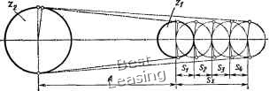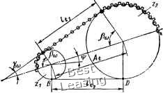 Ау4( - действительная поправка на единое межцентровое рис-стояние Ли в шагах (табл. П1); Attain -минимально допустимое межцентровое расстояние цепной передачи (табл. П7); /( - длина сопряжений цепи, определяемая по формуле ![]() для расчета И обязательно округляемая до ближайшего целого числа; Си- полуразность диаметров делительной окружности звездочек в шагах (табл. П4). Определение длины замкнутого цепного контура. В зависимости от длины U сопрягаемой ветви цепи и числа зубьев звездочек Zy и Z2 длина цепного контура Рис. 9. Кинематическая схема двухзвездиых цепных контуров В шагах Lt - 21/ + в мм L = Lit, (15» где AZ,< - действительная поправка на длину замкнутой цепи в шагах (табл. П1); здесь Ри - угол синфазности (табл. П2); и - разность чисел зубьев звездочек (и = гг - Zi). Значение длины цепного контура L/ по выражению (15) принимают без округлении, так как в иен всегда це.пое число звеньев, которое и соответствуе? межцеитровоку расстоянию, полученио.му по уравнению (12). Это возможно благодаря единому принципу расчета взаимосвязанных параметров Л; и с едиными значениями, связанными выражением (15), выведенным из исходного уравнения Lt = \A. + Ч (" - Рсо)] + 2 1/ Л-С1 ± 2АЛ,. (17) Равенство уравнений (15) и (17) вытекает из трех зависимостей, отвечающих принципу проектирования цепной передачи с повышенной кинематической точностью и равномерностью движения: 1) сумма двух частных, полученная от деления чисел звеньев на дугах обхвата звездочек на числа их зубьев, равна единице: = 1; 2) разность, полученная от вычитания из числа зубьев большей звездочки поправки на длину цепнрго контура, равна сумме чисел звеньев, располагаемых на двух звездочках передачи: Z2 - AZ-< = Wi + W2; 3) число звеньев цепи, располагаемых на дуге обхвата меньшей из двух звездочек цепного контура, выражается зависимостью Определяем единое межцентровое расстояние в шагах -со = Vi + Cl = /212 + 5,72642 = 21,767. Согласно табл. П1 по величинам ю = 36 и =21 принимаем действительную поправку на единое межцентровое расстояние и поправку на длину цепного контура: АА = -0,02: Д!, = 15. Межцентровое расстояние (мм) определяем по формуле (12)i А ~ = {А + ЬA) t = (21.767 - 0,02) 25.4 = 552.37 мм. Для горизонтального положения цепной передачи н скорости движения цепи v = = 3 м/с допускаемое отклонение на межцентровое расстояние принимаем по табл. 8 гл. В; Дя„ = - 0,5 мм; Дя„=0,22 мм. Установочное межцентровое расстояние находится в пределах = 651,87« ©552.59 мм Длину замкнутого цепного контура определяем по выражению (15)s Lf = 2lf + гг- Ai., = 2-21 + 45 - 15 = 72; L = Lft = 72-25,4 = 1828.8 мм. Пример 2. Определить оптимальное межцентровое расстояние и длину двухзвезд-ного цепного контура (желательно с четным числом звеньев) Исходные данные: шаг цепи ( = 19,05 мм: предварительное межцентровое расстояние Ае = 810825 мм согласно начальной схеме; число зубьев z, = 21 н z. = 66; передача под углом ф = 45°; скорость цепн V = 4,5 м/с. Решение. По табл П4 для разности чисел зубьев ю = z - Zi = 65 = 21 = 44 принимаем = 6,9993. Определяем длину сопряженной ветвн в шагах по формулам (14)! . Yyd = /ЩУГ» 42,73,- принимаем = 42. Определяем единое межцентровое расстояние в шагах по зависимости со = Уе+С1 = 1/422 + 6.99932 = 42.579. Согласно табл. П1 по величинам со = 44 н /j = 42 принимаем действительную пси правку A>4j на единое межцентровое расстояние А н поправку Д£, на длину цепного контура в шагах: ДЛ, = 0,345; Д£ = 19. Межцентровое расстояние (мм) определяем по зависимости (12)5 A=Aft= {А + й.А) t = (42,679 + 0,345) 19,05 = 817,70 мм. Приме