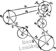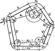 • Метод расчета разработан А. А. Готовцевым. Длину цепи определяем по аависимости (15): LLtt = (2lt + z - ALf) t = = (2-30 + 40 - 10) 15,875 = 90-15,875 = 1428,75 мм. Повышенная равномерность движения сохраняется при условии, если длина сопрягаемой ветви из-за износа в период между очередными перемещениями опор будет увеличиваться не более чем на 0,25/ Исходя из этого условия, найдем величину изменения межцентрового расстояния илн путь одной передвижки опоры S, = 0,25/ = 0.25-15,875 я 4 мм Сигналом необходимости очередной передвижки является увеличение преднего шага цепи иа величину :=™ = ет5=°«"- =0,01Д;/ = 0,01.0,84.15,875 = 0.133 мм. Длина контрольного отрезка, имеющего 20 звеньев, при увеличении шага цепи на величину Д, = 0,133 нм составляет: для первой передвижки к1 = 20 + Д, ) = 20 (15,875 + 0.133) = 320,16 мм: ДЛЯ второй передвижки и2 = 20 + 2Д, J = 20 (15,875 + 2-0,133) = 322,82 мм; ДЛЯ п-го числа передвижек ;, = 20(< + «д,. Определяем общий путь передвижки опоры, который следует предусматривать при проектировании цепной передачи с использованием данного способа регулировки, исходя иа предельно допустимого увеличения шага цепи 6 = 2,5 % и запаса в 20-50 %: S = 0,015e<< = 0,015.2,5.30.15.875 г« 18 мм. Расчет и построение многозвездных цепных передач В основу метода положен тот же принцип, что и при расчете двухзвездных передач. Сложный цепной контур располагается на звездочках таким образом, что центры элементов зацепления совпадают с центрами впадин зубьев звездочек в точках их касания со всеми сопрягаемыми ветвями цепи. При этом их длины всегда кратны шагу, а значения чисел звеньев на дугах обхвата звездочек близки или равны целому числу. Многозвездные цепные передачи по расположению звездочек в цепном контуре имеют две принципиально различные схемы построения: схема 1 (рис. 11), когда все звездочки расположены внутри цепного контура; схема 2 (рис. 12), когда хотя бы одна звездочка расположена снаружи цепного контура. Для каждой схемы расположения звездочек в цепиом контуре геометрический расчет производится по своим зависимостям. Так, первая схема (см. рис. 11) рассмотрена на примере пятизвездной передачи, в которой со звездочками сопрягаются пять ветвей цепи, при этом шаговая линия U ветви цепи не пересекается с осью межосевого расстояния Л/. Таким образом, по расположению двух смежных звездочек эта схема аналогична двухзвездной передаче и на нее распространяются общие зависимости (8) и (10) для определения углов синфазности Рц, и меж- ![]() ![]() Рис. п. Схема миогозвеэдиой цепной Рис. 12. Схема много.звездной цепной перепередачи с внутренним располсжсинем дачи при расположении звездочек с внутреи-эвеэдочек в контуре ней и внешней стороны контура центровых расстояний Лщ. Вторая схема (см. рис. 12) рассмотрена также на примере пятизвсздной передачи, в которой звездочки сопрягаются с пятью ветвями цепи, при этом четыре шаговые линии I2, I3, U и /g пересекаются с осями межцентровых расстояний At, и иа них распространяются зависимости (9) и (И). Определение межцентровых расстояний. В связи с различным расположением звездочек в сложном контуре мсгкиентровые расстояния Л и Л, вычисляют по выражениям, соответствующим действительным схемам (см. рис. 11 и 12): для пары смежных звездочек, расположенных внутри контура без пересечения осей Л(о и ,„: в шагах Л,, = Vil, -f С?, = -Jl в мм Л = A,J; (18) для пары смежных звсздокк, расположенных внутри и снаружи контура с пересечением осей Л и 1: в шагах Л = V
