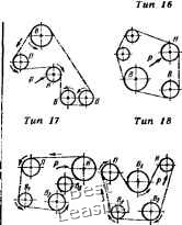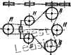 Тип и схема передачи Конструктивные особенности передачи Тип 11 Тип 12 Тип 13 Четырехзвездные Ведущая и две ведомые звездочки вращаются в одиом направлении Тип 14 Ведущая и одна ведомая звездочки вращаются в одном направлении, а вторая ведомая звездочка Ва - в иаправлеиии, противоположном двум первым. Ведущую П и направляющую Н звездочки можно менять местами, при этом все ведомые звездочки будут вращаться в одиом направлении Тип 15 ![]() Тип 19 ![]() Пятизеездные Ведущая П и три ведомые звездочки вращаются в одиом направлении. Ведущая и две ведомые звездочки В, и Вг вращаются в одном направлении, а третья ведомая звездочка В - в обратном направлении. В передачах типа 19 ведомая Вз и натяжная Н звездочки могут меняться местами. Тогда все три ведомые звездочки будут вращаться в одном направлении Тип и схема передачи Конструктивные особенности передачи ![]() Тип 21 ![]() Семизвездная, тип 22 ![]() Вссьмизеездная Тип 23 ![]() Одипиадцитизеездпал Тип 24 В В в в в в Мнсгозвездные В передаче типа 20 ведущая П и две ведомые звездочки вращаются в одном направлеини, третья ведомая звездочка Вз вращается в противоположном направлении. Обводная О звездочка в случае необходимости может быть использована как четвертая ведущая звездочка. Допускается взаимная перестановка натяжной Н я ведущей Вз звездочек. При проектировании необходимо предусмотреть возможность перемещения только натяжной звездочки в указанном направлении иа длину 2-4 шага для регулировки натяжения цепн в процессе работы В передаче типа 21 ведущая и две ведомые звездочки, расположенные внутри цепного контура, вращаются в одну сторону, две другие ведомые звездочки, расположенные снаружи контура, вращаются в противоположную сторону Ведущая П и четыре ведомые звездочки, расположенные внутри контура, вращаются в одном направлении, одна ведомая звездочка, расположенная снаружи контура, вращается в противоположном направлении. При конструировании в случае необходимости допускается замена одной из ведущих звездочек обводной (холостой), в этом случае иет необходимости предусматривать ее перемещение с целью регулировки натяжения цепи При конструировании в случае необходимости допускается замена ведомых звездочек на обводные (холостые) и наоборот. Основное правило проектирования многозвездной цепной передачи (более трех звездочек) - предусматривать в контуре одну натяжную звездочку, которую можно перемещать для регулировки натяжеиня цепи в процессе работы передачи. В специальных передачах ниогда число натяжных, оттяжных и обводных звездочек равно числу рабочих звездочек Тип и схема передачи Конструктивные особенности передачи Передачи в горизонтальной плоскости Деухзвездная Тип 25 Передачи с числом звездочек больше трех Тип 26 Сложная со специальным устройством, тип 27 ![]() Спаренная, тип 28 Звездочки расположены горизонтально в плане. При проектировании подобной передачи рекомендуется принимать самое короткое межцентровое расстояние. Число зубьев меньшей звездочки следует принимать не менее 27. Рекомендуется применять упругие звездочки из резины или полимеров В передаче типа 26 звездочки вращаются в одном направлении. Дополиительиая натяжная (направляющая) звездочка илн ролик с ребордами дает возможность применять также передачи с межцеитровым расстоянием в 1,5-2 раза большим, чем обыч