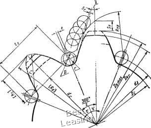 Выбор основного профиля зубьев звездочки по надежности сцепления с цепью Для обеспечения надежного сцепления звездочки с цепью ракомендуется при проектировании цепной передачи предусматривать нормальный способ зацепления (<зц 5» tgi) [27]. Нормальное зацепление имеет место тогда, когда все звенья цепи, нахвдящиеся на дугах обхвата ведомой и ведущей звездочек, контактируют ![]() Ипс. 5. График распределения нагрузки между зубьями: I - звездочка с высотой зуба по гост 592-56; 2 - звездочка с повышенной высотой зуба по ГОСТ 592 - 75 С зубьями. При ЭТОМ отношение полного рабочего натяжения цепи к натяжению ведомой илн холостой ветви должно быть -#->3. Для свободного входа звеньев цепи в контакт с зубьями необходимо принимать радиальный зазор между рабочей поверхностью зуба и траекторией элемента зацепления (рис. 6) S, > 0,12 D, а траекториальный зазор образуемый между наружной окружностью зубьев Dg и точкой пересечения траектории движения ролика цепи с осью зуба, St > 0,2 /. Для создания условий беспрепятственного выхода звеньев цепн нз впадин зубьев в конце зацепления, особенно для ведомых звездочек, необходимо значение половины угла зуба принимать по зависимости V > 1,2 arctg х, где л - коэффициент треиия скольжения в паре зуб звездочки - ролик цепи. Для повышения надеж1юсти сцепления звеньев цепи с зубьями звездочки следует стремиться к увеличению числа зубьев, участвующих в зацеплении, что обеспечивается применением звездочек с числом зубьев г > 15. В случаях, когда габаритные размеры передачи ограничивают применение таких звездочек, рекомендуется для улучшения надежности сцепления проектировать звездочки с малым числом зубьев, но с повышенной хордальной высотой зуба. Выполненными экспериментальными исследованиями и сравнительными испытаниями было установлено, что соответствующим повышением высоты зубьев можно значительно увеличить число зубьев, участвующих в зацеплении, и тем самым повысить надежность сцепления. В качестве объекта экспериментальных исследований были приняты звездочки г = 8 (тип 2, табл. 3) с наибольшей хордальной высотой зуба, подсчитанной по формуле / шах = 1.3- = 1,3- 1,0, и эти же звездочки, но со срезанными зубьями (kt = 0,5). В качестве критерия надежности сцепления были приняты число зубьев, участвующих в передаче окружного усилия, и величина давления на зубья звездочки. Действительные их значения определяли путем измерения деформации с помощью тензометров, наклеенных на зубья звездочек. В результате обработки осциллограмм установлено, что при применении звездочек г = 8 со срезанными зубьями (kt = 0,5) среднее число зубьев, участвующих в зацеплении, составляет 2,87 зуба, а для звездочек с увеличенной высотой при kt - 1,0 -в 1,8 раза больше (в среднем 5,15 зуба). ![]() Рис. 6. Схема построения зуба звездочки: S - зазор между рабочей поверхностью зуба и траекторией Полученные результаты позволили сделать вывод, что при работе звездочек с увеличенной высотой зуба (kt = 1,0) действительный текущий угол зацепления в 1,6 раза больше, чем при работе звездочки с kt - 0,5. Следовательно, звездочка с г = S при kf = 1,0 по надежности сцепления соответствует звездочке г = 13 при kt - 0,5. Аналогичные результаты были получены при обработке осциллограмм нагрузок, действующих на зубья звездочек. По полученным результатам построена диаграмма давления на зубья по дуге обхвата (см. рис. 5). Из 