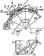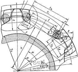 Рис. 30. Упрощенная конструкция звездочки для целей различного шага ![]() ![]() Рис. 31. Построение профилей зубьев звездочек для круглозвенных цепей лри комбинированном зацеплении Рис. 32. Построение профилей зубьев для круглозвенных целей лри зацеплении за горизонтальное звено по ГОСТ 13561-77 Выбор основного профиля и схемы зацепления по износостойкости Звездочки для работы с цепями, имеющими круглозвенные элементы зацепления, испытывают значительные контактные напряжения, которые являются причиной быстрого износа зубьев и звеньев. Контактные напряжения в зоне контакта звена цепи с зубом звездочки определяются по формулам: при прямолинейном и прямолинейно-выпуклом основных профилях зуба (см. рис. 25, а, б): с прямолинейным профилем зуба в плане (см. рис. 28, а) ОД max = фс \ Pv. гаах (-f-) . (31) где Фс коэффициент способа зацепления; при зацеплении за вертикальное звено фс = 0,44, при зацеплении за горизонтальное звено ~ 0,366; с вогнутым профилем зуба в плане (см. рис. 28, е) ОД max = с у max Е ---- ; (32) при выпуклом основном профиле зуба (см. рис. 25, е): с прямолинейным профилем зуба в плане (см. рис. 28, а) ОД max = фс I k max Е (- + с вогнутым профилем зуба в плане (см. рис. 28, б) з> ОД max = Ч. ]/р. max [ + " (33) (34) Максимальное усилие на зубе Рктах, с которым звеио цепи воздействует на зуб звездочки, зависит от рабочего натяжения Р ведущей ветви и числа зубьев. При зацеплении за звенья одного вида усилие на зубе достигает максимума в момент, когда следующее звено начинает контактировать с зубом. Положение звеньев в этот момент и действующие на них усилия представлены иа рис. 33. В случае зацепления за вертикальное звено радиус впадины г и длина опорной площадки зависят от ширины звена цепи В (рис. 29, б), т. е. / = 0,5 В; Li:> В. При этом нерабочую часть впадины зуба занижают на 1,5-2 мм или скругляют радиусом Rx (рис. 29, а, б). Для компенсации разноразмерности звеньев цепи и свободного их размещения во впадинах зубьев целесообразно предусматривать смещение центров дуг впадин или компенсирующий зазор е <: 0,031 Vг (рис. 29). Для временных передач и при отсутствии цепей нужного шага можно рекомендовать ведущую звездочку с зацеплением за горизонтальное звено, у которой зубьями являются приваренные к ступице пластины с V-образной прорезью для размещения вертикальных звеньев (рис. 30). Для придания таким зубьям жесткости к торцам пластин приваривают диски. Такие звездочки можно изготовлять даже в небольших мастерских. Расчет профилей звездочек к круглозвенным цепям рассмотрен в табл. 11, а их построение приведено на рис. 31 и 32. ![]() Рк шах 1) Рис. 33. Схема определения максимального усилия Р /Vfjfl круглозвенныж цепей при зацеплении за звено: а - горизонтЕЛьное; 6 - вертикальное ![]() на зубе звездочки Из условия равновесия шарнира 1 следует формула для определения усилия в звене 2 cos с Усилие Ркгаах определяют из условия равновесия шарнира 5, находящегося под действием усилия Р, Р, sin т Я tfj т Рк max - Sin (т + V) sin (т + V) • (35) По мере износа цепи усилие Ртах изменяется, и, когда зацепление перехочет к типу якорного, величину его определяют по известной формуле, примени MOii к якорному и комбинированному зацеплениям. sm и. sin (а, + у) (36) Величина максимального усилия иа зубе звездочки Ритах С ростом числа зубьев с1П1жается (рис. 34). Минимальное усилие Рщлах характерно для комби-ипровапиых звездочек (профиль зуба типа 5, табл. 2), особенно при малых числа