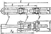 ТЯГОВЫЕ ЦЕПИ По конструктивным признакам тяговые цепи подразделяют на три основных вида: пластинчатые (втулочные, роликовые и катковые) по ГОСТ 588-74; разборные (с фиксированными и вращающимися валиками) по ГОСТ 589-74; тяговые круглозвенные (нормальной и повышенной прочности) соответственно по ГОСТ 2319-70 и ОСТ 12.44.013-75. Тяговые пластинчатые цепи Тяговые пластинчатые цепи в соответствии с ГОСТ 588-74 изготовляют типов: 1 - втулочные; 2 - роликовые; 3 - катковые с гладкими катками; 4 - катковые с ребордами на катках. Цепи указанных типов изготовляют двух исполнений: 1 - неразборная конструкция; 2 - разборная конструкция. Примеры условных обозначений: цепи тяговой пластинчатой с номером М1250 (с разрушающей нагрузкой 1250 кН), типа 2, с шагом 630 мм, исполнение 2: Цепь М1250-2-630-2 ГОСТ 588-74 то же, с номером М20 (с разрушающей нагрузкой 20 кН), типа 1, с шагом 63 мм, исполнения 1: Цепь М20-1-63-1 ГОСТ 588-74 Тяговые пластинчатые цепи (табл. 6 и рис. 7) состоят из наружных и внутренних звеньев. Поворот в шарнире при набегании звеньев втулочной цепи на зубья звездочек происходит между валиком и втулкой. В роликовых цепях (см. табл. 6, тип 2) на втулках свободно вращаетси ролик, чем эта цепь и отличается от втулочной (см. табл. 6, тип 1). Катковые цепи вместо роликов имеют катки: гладкие (см. табл. 6, тип 3) или с ребордами (см. табл. 6, тип 4). При правильном выборе и применении тяговые пластинчатые цепи обеспечивают надежную работу в пределах 10 ООО-20 ООО ч Рис. 7. Тяговая втулочно-роликовая л более, цепь Тяговые разборные цепи Цепи (табл. 7) составляют из внутренних / и наружных 2 звеньев, соединен-ных валиками 3. В соответствии с ГОСТ 589-74 применяют цепи двух типов: с вращающимися (тип Р1) и с фиксированными (тип Р2) валиками. В разборной цепи типа Р1 валики имеют средние и крайние буртики, прн этом средние буртики выполнены с внутренними угловыми фасками для возможности поворота внутренних звеньев в пространстве на заданный угол 8-10°. С целью предотвращения от «саморазборки» цепи в процессе эксплуатации диаметр и ширина буртиков, а также ширина паза пластины в месте ввода валика выполнены согласно зависимости В :> d cos а Л sin а, где В - ширина паза звена в месте ввода валика; d - диаметр буртика; h - ширина буртика; а - угол наклона валика к пластине при сборке или разборке. ![]() 7. Тяговые разборные цепи по ГОСТ 589-74 Тип Р1 L Тип Р2 ![]() J - звено внутреннее; 2 - звено наружное; 3 - валик Размеры, мм «я S Шаг зацепления Нагрузка, кН, не более 8 Удлинение общее, % о» р. О) се о я щ :t2,0 ±2,5 250 500 t3,0 30 21 48 60 96 160 132 220 34 73 174 290 240 400 Примечание. Измерение шага цепи производится прн нагрузке, составляющей 0,01 разрушающей. ![]() Рис. 8. Характер износа деталей разборной цепи типа: « - Р; б - Р? Для упрощения сборки и разборки цепи на одном из средних буртиков имеется лыска. Такое выполнение конструкции разборной цепи обеспечивает отсутствие саморазборки цепи в процессе эксплуатации и повышенную износостойкость благодаря тому, что валик в процессе работы вращается, а следовательно, контактирует по всей окружности. В разборной цепи типа Р2 валики имеют две головки прямоугольной формы, упирающиеся в выступы наружного звена, которые препятствуют проворачиванию валиков в наружном звене. Поворот в шарнире происходит за счет перемещения во внутреннем звене валика всегда по одной и той же контактирующей поверхности, в связи с чем износ валиков при тех же режим