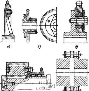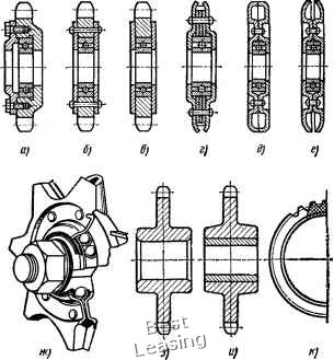 ![]() г) ff) Рис. 46. Звездочки с предохранительными устройствами струкции звездочки в ценной передаче, работая подобно демпферу, гасит колебания нагрузки в цепной передаче. Для упругого соединения двух соседних валов применяют звездочки с двойной цепью - цепную муфту (рис. 46, д). Муфта легко разбирается без демонтажа валов. Применяемые в ней звездочки должны иметь малое радиальное биение окружности впадин зубьев, так как незначительный перекос валов будет вызывать осевое биение цепи. Натяжные звездочки (рис. 47), применяемые в цепных передачах, устанавливают как на подшипниках качения, так и иа подшипниках скольжения. Гра-хтпл их прн.мспения зависит от скорости вращения: до 1 м/с применяют подшип-1ШКИ скольжения, свыше I м/с - подшигшикн качения. Если звездочка изготовлена из антифрикцимшых материалов (чугуна, полимеров), то втулку не ставят (рис. 47, э). Установку втулок из чугуна, бронзы, металлокерамики, полимеров предусматривают в натяжных стальных звездочках (рис. 47, и). Наиболее распространенные натяжные звездочки с подшипниками качения показаны на рис. 47, а. Однако более экономичными являются звездочки, показанные на рис. 47, б, б. Они менее металлоемки. Крышки, удерживаюидае подшипники от осевого перемещения, крепят к звездочкам либо заклепками (рис. 47, б), либо контактной сваркой (рис. 47, в). Пакетные натяжные звездочки (рис. 47, г) не имеют отдельных крышек, удерживающих подшипник, их роль выполняют наружные зубчатые диски. Натяжные звездочки с полыми зубчатыми венцами (рис. 47, д, е) весьма экономичны и надежны. На рис. 47, ою показана натяжная звездочка с наборным шариковым подшипником, у которого роль верхнего кольца выполняет тело звездочки. Более рациональным следует считать применение подшипников с разовой смазкой. Упругую натяжную звездочку, монтируемую между ведущей и ведомой ветвями цепной передачи и контактирующую своими зубьями (см. рис. 25, гл. 3) с ними, изготовляют из резины со стальными армируюпщми элементами (рис. 47, к) или в виде пружинящих ленточных звездочек. Однако для натяжения цепи и регулирования ее провисания могут быть применены и обычные звездочки, в том числе и изношенные (желательно с числом зубьев, близким к числу вубьев большей звездочки). Соединения звездочек с валом могут быть выполнены (рис. 48) резъемными и неразъемными, а также подвижными и неподвижными. Фрикционные соединения применяют преимущественно в тех случаях, когда нагрузка на вал настолько высока, что концентрация напряжений в надрезах при профильных соединениях недопустима (рис. 48, а, б). В частности, это относится к тем случаям, когда диаметр вала по конструктивным соображениям принят наибольшим. Коническое соединение - легкоразъемное (рис. 48, е). Профильные соединения применяют преимущественно в тех случаях, когда возникает необходимость периодически снимать звездочку с вала (рис. 48, г-ж). Когда ожидается возникновение ударных нагрузок, следует избегать применения призматических или сегментных шпонок, так как в процессе работы они подвергаются смятию, что затрудняет снятие звездочки с вала. Предварительно-напряженные профильные соединения, как и обычные профильные соединения, обеспечивают точную установку звездочки относительно вала, но не имеют зазора в сопряжении, в связи с чем они больше подходят для работы при ударных нагрузках (рис. 48, з-«). ![]