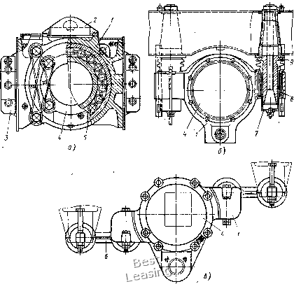 Примечание. В числителе дана нагрузка при = 1,18, в знаменателе - при = 1,25. поверхностной коррозии трения, части оси где М - расчетный момент, действующий в сечении оси, совпадающей с плоскостью круга катания, Н-м; п„ - коэффициент запаса прочности, равный 1,2-1,3; a i - предел выносливости оси в зоне напрессовки при знакопеременном изгибе, равный 140 МПа для осевой стали; 0 - припуск на обработку при ремонте, пав-ный 0,05d, мм. . f f , Р ь Для перспективных локомотивов с опорно-осевой подвеской тягового двигателя диаметр подступичной части d> 0,071 2Я„, где2Я - максимальная нагрузка от колесной пары на рельсы, кН; - диаметр колеса, мм. Подсчитанные по формуле (14) диаметры подступичной части оси при заданных значениях 2П, D„ и п„ приведены в табл. 5. § 16. БУКСОВЫЕ УЗЛЫ Буксовые узлы предназначены для передачи нагрузок от главной рамы локомотива или рамы тележки на шейки осей колесных пар, а также сил тяги и торможения, направляющих усилий от шейки осей колесных пар на раму. Кроме того, буксовые узлы ![]() Рис. 47. Букса с подшипником скольжения: 1 - крышка; 2 - корпус; 3 - подшипник; 4 - резервуар для смазки буксовых направляющих; 5 - антифрикционный диск; 6 - шейка оси ![]() Рис. 48. Букса с подшипником качения тепловоза 2ТЭ116: 1 - крышка; 2 - корпус; 3 - подшипник; 4 - шейка осн; 5 - кольцо лабиринтное; 6 - крышка задняя; 7 - упорный шарикоподшипник; 8 - упор; 9 - амортизатор; 10 - пружина ограничивают продольные и поперечные перемещения колесной пары относительно рамы. Вертикальные статические нагрузки на буксовые узлы достигают 100-120 кН, а при колебаниях во время движения локомотива они возрастают в 1,3-1,5 раза (у экипажных частей с короткой базой в 1,7 раза). Увеличивают напряженное состояние элементов буксового узла продольные тяговые и тормозные усилия, достигающие 20-30 кН, а также удары колес на стыках, вызывающие ускорение букс (7-12) g при частоте вибраций до 80 Гц. На подшипники, воспринимающие осевую нагрузку, действуют к тому же пульсирующие силы (рамные усилия) до 80-100 кН при частоте осевого нагружения 1,5-2,0 Гц. Совокупность этих сил вызывает деформации элементов буксового узла, частота вращения подшипников которого достигает у скоростных локомотивов 10-13 с-. Условия работы буксовых узлов привели к тому, что были созданы разнообразные их конструкции, различающиеся по способу передачи тяговых и тормозных усилий, передачи вертикальной нагрузки, восприятия осевых нагрузок, а также по типу подшипников и другим характеристикам. В буксах применяют два типа подшипников скольжения (рис. 47) и качения (рис. 48). Подшипники скольжения использовали на отечественных электровозах выпуска до пятидесятых годов, а также на первых отечественных серийных тепловозах ТЭ1 и ТЭ2. Для изготовления этих подшипников требуется большое количество цветного металла. При эксплуатации необходимо повседневно наблюдать за ними и тщательно обслуживать. Кроме того, они существенно повышают сопротивление движению локомотива. Поэтому все локомотивы, выпускаемые в настоящее время, оборудованы буксами с подшипниками качения. По способу передачи силы тяги различаются буксовые узлы челюстные- (рис. 49, а), поводковые (рис. 49, б) и с цилиндрическими направляющими (рис. 49, б). На локомотивах ранних выпусков широко распространены челюстные буксовые узлы. Эти узлы имеют наиболее простую конструкцию и наименьшую стоимость. Однако им свойс