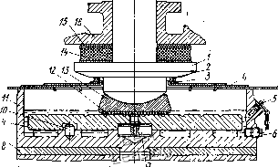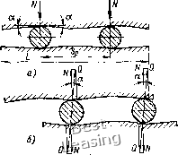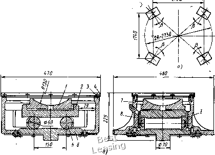 ![]() Рис. 63. Опора скольжения тепловоза ТГМ4: / - пята; 2 - уплотиительиое кольцо; 3 - прокладка; 4 - защитные листы; 5 - маслоуказатель; 6 - пробка; 7 - фиксатор; 8 - боковина рамы Тележки; 9 - опорная плита; 10 - штифт; --корпус опоры; 12 - прокладка текстолитовая; 13 - гнездо; 14 - амортизатор; 16 - регулировочная прокладка; 16 - кронштейн опоры; 17 - шайба; 18 - гайка ские опоры скольжения, установленные на боковинах рамы тележки и одинаковом расстоянии от шкворня. Шкворень в этом случае воспринимает горизонтальные продольные и поперечные силы, действующие между кузовом и тележкой, не передавая вертикальную нагрузку на тележку. Опора скольжения тепловоза ТГМ4 (рис. 63) имеет сферическую пяту /, установленную вместе с резиновым амортизатором 14 в раме кузова. Пята опирается на сферическое гнездо IS, которое передает нагрузку на опорную плиту 9, установленную в литом корпусе . Пяту, гнездо и опорную плиту изготовляют из стали 45, поверхности трения их подвергают закалке до твердости HRC 50. При перемещении тележки относительно рамы тепловоза -происходит скольжение текстолитовой прокладки 12, вставленной в гнездо, по опорной плите. Полость корпуса опоры заправлена осевым маслом ГОСТ 610-72. Для улучшения смазывания трущаяся поверхность плиты разбита канавками на небольшие квадраты. У тепловоза ТЭМ2 сферическое гнездо скользит по опорной плите, поверхность которой армирована антифрикционным материалом, например бронзой или сплавом ЦАМ 9-1,5 ГОСТ 21437-75. Опоры скольжения допускают давление на поверхности трения до 20 МПа и скорость скольжения до 7 м/с. На некоторых зарубежных и отечественных локомотивах, например на электровозах ВЛ80", ВЛЮ, ЧС4, применяют опоры скольжения, на которые кузов опирается через пружины рессор- Рис. 64. Роликовые опоры главных рам теп- ловозов: а - схема размещения (ТЭЗ, 2ТЭ10Л); б - роликовая опора (2ТЭ10Л); / - гнездо; 2 - опорная верхняя плита; 3 - прокладка; 4 - крышка; 5 - ролйк; 6 - опорная нижняя плита; 7 - корпус; " - обойма; / - плоскость трения ![]() ного подвешивания. Кузов может перемещаться на опорах в поперечном направлении относительно тележки, при этом шкворень сжимает пружины возвращающего устройства, установленного в раме тележки и препятствующего этому перемещению. Роликовое опорно-возвращающее устройство. Тепловозы ТЭЗ, 2ТЭ10Л имеют шкворень, который передает продольные и поперечные горизонтальные силы и позволяет тележке поворачиваться относительно кузова на 3-4°. Нагрузка от кузова передается на четыре роликовые опоры (рис. 64, а), которые размещены на боковинах рамы тележки. Каждая опора повернута на угол р относительно радиуса, соединяющего центр поворота тележки и центр опоры. Такой поворот позволяет создать момент трения, необходимый для гашения горизонтальных угловых колебаний тележек (виляния). Роликовая опора главной рамы (рис. 64, б) передает нагрузку на гнездо /, в свою очередь нагружающее верхнюю onopnyip плиту 2, опирающуюся через ролики 5 на нижнюю плиту б.. Расстояние между роликами зафиксировано обоймами 8. Весь механизм опоры расположен в корпусе?, заполненном осевым маслом. Сверху на корпусе опоры при помощи крышки 4 закрепляют брезентовый чехол, защищающий внутреннюю полость опоры от влаги и пыли. Поверхности качения плит выполнены наклонными; угол наклона а составляет 2°-3° 30 в зависимости от типа тепловоза. На прямом участке пути ролики занима