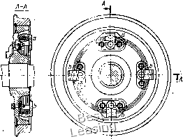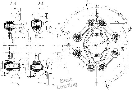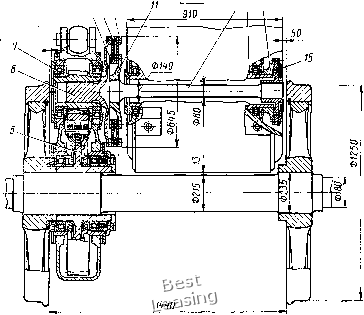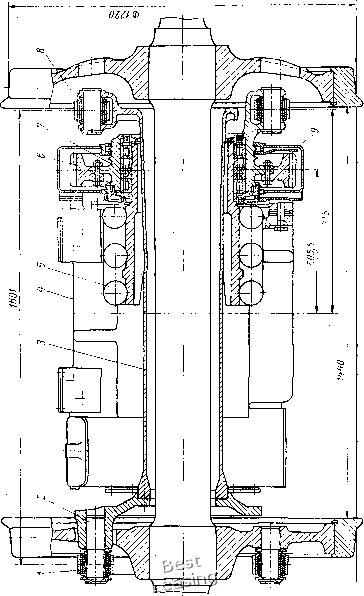 ![]() Рис. 87. Упругая проволочная муфта для опорно-центрового подвешивания тягового элект)одвига-теля ![]() Рис. 88. Колесно-моториый блок тепловоза ТЭП60: / - колесная пара; 2 - полый вал; 3 - вкладыши подшипника; 4 - тяговый электродвигатель; 5 - кожух тягового редуктора; 6 - плавающая рамка; 7 - ведущая шестерня; 8 - венец зубчатого колеса; 9 - кронштейн муфты возникает трение между витками проволоки, способствующее гашению колебаний в приводе. Конструкция опорно-рамного подвешивания тягового двигателя. Приводы с компенсирующими элементами, расположенными на стороне большего крутящего момента. Опорно-рамный привод такой конструкции был впервые применен на тепловозе ТЭП60. В колесно-моторном блоке этого тепловоза (рис. 88) полый вал 2 вращается в подшипниках скольжения 3, расположенных в корпусе тягового электродвигателя 4. Корпус двигателя опирается на раму тележки в трех точках. Две точки - приливы корпуса двигателя, третья -литой кронштейн 9, который крепят к двигателю при помощи восьми болтов. Перемещения рамы тележки относительно оси обусловлены зазором между валом и осью, равным при статическом положении локомотива 35 мм. Полый вал 2 состоит из стальной трубы, на обработанные торцы которой насажены тепловым способом литые детали, получившие название приводов шарнирно-поводковой муфты. Предварительно обработанные поверхности полого вала под подшипники (шейки) упрочняют накаткой на глубину 5 мм, затем обрабатывают окончательно под диаметр 315,6 мм. На один из приводов полого вала также тепловым способом монтируют венец 8 ведомого зубчатого колеса, который дополнительно закрепляют призонными болтами М20. Зубчатый венец изготовляют из стали 45ХН, зубья подвергают контурной закалке токами высокой частоты до твердости HRC 46-52. Ведущую шестерню 7 изготовляют из стали 12ХН4А, зубья цементируют и подвергают поверхностной закалке до твердости HRC 56. Шестерню насаживают на конический вал якоря тягового двигателя тепловым способом. Натяг между валом и шестерней, измеряемый в осевом направлении, составляет 1,25 мм. Крутящий момент от полого вала колесной паре передается через шарнирно-поводковые эластичные муфты, расположенные с наружной стороны колесных центров (рис. 89). Конструкция механизма передачи крутящего момента допускает максимальные вертикальные перемещения оси колесной пары относительно рамы тележки не более 35 мм. Муфта состоит из плавающей рамки 6, поводков 5, пальцев / колесной пары, пальцев 2 полого вала, резинометаллических втулок (амортизаторов) 3. Ведущие поводки муфт одним концом присоединены к пальцам полого вала, другим - к пальцам плавающей рамки. Ведомые поводки соединяют плавающую рамку с колесным центром. При относительных колебаниях рамы тележки и колесной пары появляется несоосность полого вала и оси колесной пары: поводки муфт получа1ют линейные и угловые перемещения. Для компенсации сложных угловых перемещений в соединениях поводков установлены резинометаллические втулки 3, являющиеся шарнирами без технологических зазоров. Поводки с правой и левой стороны колесной пары имеют встречное расположение с углом сдвига плавающих рамок около 45°. ![]() Рис. 89. Шарнирно-поводковая эластичная муфта: / - палец колесной пары; 2 - палец полого вала; 3 - резинометаллическая втулка; 4 - соединительный валик; 5 - поводок; 6 ~ плавающая рамка Такое р