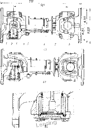 За исходную расчетную нагрузку принят крутящий момент Мад = 17,9 кН-м на I максимальном режиме, соответствующем длительной скорости. Далее в соответствии с ГОСТ 21354-75 определяют расчетные и допускаемые напряжения на контактную выносливость, а также на усталостную прочность. После этого рассчитывают контактные и изгибные напряжения, действующие на зубья передачи при максимальной нагрузке. При расчете тяговых редукторов пассажирских локомотивов были получены следующие значения напряжений, МПа (в числителе- для шестерни, в знаменателе - для колеса). ТЭПбО ТЭП70 ТЭП75 На усталостную прочность Контактное напряжение: расчетное ад........... 575/575 710/710 770/770 допускаемое а hp......... 943/698 959/720 957/715 Напряжение изгиба: расчетное Ор........... 171/165 192/199 210/218 допускаемое арр......... 247/195 235/195 235/195 На статическую прочность при трогании Контактное напряжение: максимальное расчетное amax • • ЮЗЗ/ЮЗЗ 1147/1147 1240/1240 допускаемое предельное адашах . . 2320/2000 2320/2000 2320/2000 Напряжение изгиба: максимальное х....... 275/306 347/397 387/443 допускаемое аррах ....... 665/490 665/490 665/490 § 23. КАРДАННЫЕ ПРИВОДЫ Карданные приводы состоят из карданных валов, раздаточных и осевых редукторов. При проектировании карданного привода стремятся обеспечить небольшие углы наклона карданных валов. Минимальные моменты инерции вращающихся масс и хорошую их балансировку. Карданные приводы должны быть максимально унифицированы, иметь однотипную конструкцию карданных валов, раздаточных и осевых редукторов. В карданном приводе крутящий момент от коробки передач к осевым редукторам передается через карданные валы, наличие которых вследствие шлицевых и шарнирных соединений позволяет обеспечивать осевые и угловые смещения одного связываемого агрегата относительно другого. Это имеет место, например, при вписывании тепловоза в кривую. Элементы карданного привода работают в тяжелых условиях. Так, осевой редуктор привода установлен на ось колесной пары, которая при движении локомотива испытывает удары на стыках и других неровностях пути. При этом ускорения оси и корпуса редуктора могут достигать 100 м/с и более. Передаваемый редукторами мощных локомотивов крутящий момент составляет 40 кН-м и более (при трогании). ![]() Рис. 93. Карданные валы тепловоза ТГМ4: а - с разъемными проушинами; б - с неразъемными; в - с бессепараторнымн подшипниками; / - фланец; 2 - игольчатый подшипник в сборе; 3 - крестовина; 4,7 - вилки; 5 - балансировочный, груз; 6 - уплотнение в сборе; * - болт В элементах привода вследствие фрикционных автоколебаний при буксовании возникают динамические нагрузки, в 3-4 раза превосходящие максимальные статические нагрузки при трогании. Динамические нагрузки возникают также и в результате колебаний надрессорного строения, виляния тележек, наличия углов излома карданных валов, вибрации, источником которых являются главным образом зубчатые передачи. При таком сложном и тяжелом характере нагрузок масса, приходящаяся на единицу мощности, локомотивного привода обычно в 2-4 раза меньше такой же массы стационарного. Карданный вал тепловозов ТГМ4, ТГМ6, (рис. 93, а) состоит из двух фланцев /, вилки 4 (сталь 37ХС) с внутренними шлицами, надеваемой на хвостовик второй вилки 7 (сталь 45Г2) с наружными шлицами. У карданного вала, связывающего осевой редуктор с выходным валом коробки передач, вследствие большой длины вала хвостовик приварен к труб