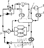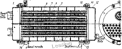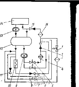 выпутдоздуха 5 ![]() Вход, Рис. 116. Водяной топливоподогреватель: /, 12 - крышки; 2 - верхняя трубная доска; 3, И - прокладки; 4 - кольцо; 5, 13, 14 - штуцера; 6 - трубка; 7 - перегородка; 8 - пластина охлаждающая; 9 - обечайка; 10 - нижняя трубная доска локомотивах применяют газовые и водяные топливоподогреватели различной конструкции. . Водяные топливоподогреватели пожаробезопасны и более надежны в работе, поэтому они широко распространены в практике локомотивостроения. Топливоподогреватель (рис. 116) тепловоза ТЭМ2, представляет собой цилиндрический корпус 9 с приваренными с обеих сторон трубными досками 2 и 10. В доски вварены стальные трубки 6. Трубные доски закрыты крышками 1 и 12 со штуцерами, предназначенными для присоединения водяных трубопроводов системы охлаждения двигателя. Крышки 1 я 12 прикреплены болтами к трубным доскам. В корпус топливоподо-гревателя вварены три штуцера, к двум штуцерам 13 и 14 подсоединены трубы, идуш,ие от переключательного крана, а к третьему 5 - труба с краном, служащая для спуска воздуха и эмульсированного топлива из корпуса топливоподогревателя. Внутреннее пространство подогревателя разделено перегородками 7, которые заставляют топливо при движении лучше омывать водяные трубы, Топливоподогреватель локомотива можно отключать от топливной системы трехходовым краном. При этом топливо сразу идет на слив в бак. Топливоподогреватели рассчитывают на основе общих принципов расчетов теплообменников. Проводя тепловой и гидравлический расчет, одновременно выбирают оптимальную форму и размеры поверхности теплообмена. § 27. МАСЛЯНАЯ СИСТЕМА Масляная система локомотива служит для смазки трущихся частей энергетической установки, гидропередачи и вспомогательных агрегатов локомотива; отвода тепла от энергетической уста- новки; размещения запасов, фильтрации, охлаждения и подогрева масла (в холодное время года), К масляной системе относятся масляные насосы, масловоздушные радиаторы или водо-масляные теплообменники, фильтры, регулирующие клапаны, трубопроводы, контрольно-измерительные приборы, масляные баки. К маслу, применяемому для смазки дизеля, гидропередачи и ГТУ, предъявляют различные требования. Для обеспечения нормальной работы двигателя дизельные масла должны иметь определенную вязкость, сохранять смазывающие свойства при высоких и низких температурах, обладать высокой термической и противоокислительной стабильностью. Марка дизельного масла установлена ГОСТом. По наличию присадок и величине кинематической вязкости в зависимости от типа дизеля применяют масла, вязкость которых (12-4-22) • 10"" mVc при 100 °С, Масло для гидропередачи и ГТУ должно обладать малой вязкостью (повышение вязкости увеличивает потери на трение в лопастной системе) и высокими смазочными свойствами при температуре 100-150 °С. На современных мощных тепловозах с гидроприводом масляную систему дизеля со вспомогательным оборудованием выполняют отдельно от масляной системы гидропередачи. Схемы масляных систем. К масляной системе дизеля предъявляют требования в ряде случаев взаимоисключающие. Так, для улучшения работы подшипников необходимо повышать давление масла, но это приводит к резкому увеличению сопротивления в холодильнике, вызывает необходимость упрочнять его элементы (трубки, перегородки и т. д.). Для обеспечения этих требований кон