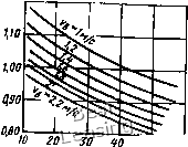 jsmp ![]() <5вд). кг/с, известные из технической характеристики насосов дизеля; температуры масла на входе /м и выходе /м теплообменника, также известные из технической характеристики дизеля; температура воды на входе теплообменника вд принимается в соответствии с выбранной ранее схемой движения воды через теплообменники в контуре. Перед расчетом выбирают наружный с/н и внутренний диаметры трубок охлаждающего элемента, разбивку трубок в трубной доске, которая обусловлена наименьшим расстоянием между соседними трубками 6; число ходов охлаждающей воды гвд. После теплового выполняют гидродинамический расчет теплообменника, который заключается в определении гидравлических сопротивлений масляного иводяного трактов. Полное гидравлическое сопротивление. Па, масляного тракта теплообменника 50tt;c Рис. 132. Зависимость коэффициента Ртр от средней температуры ср и скорости Ив воды в трубках Рг„ \0.14, где /Пт - количество рядов трубок, перпендикулярных к потоку масла; С, р - экспериментальные константы. Для теплообменников с сегментными перегородками при (4 = Ю мм и б = 3 мм в диапазоне Re„ = 10250 константа р = 0,65. Значение С принимают по графику (см. рис. 130). Гидравлическое сопротивление водяного тракта теплообменника (Па) Арвд = гвд (0,31 ± -f 1,4) (увдРвд)/2, где L - полная длина трубок, м; рр - коэффициент, зависящий от средней температуры др и скорости Увд воды (рис. 132). Расходы мощности (Вт) на прокачивание воды и масла через теплообменники Лвд = РвдЧвд РмЛм где Лвд. Лм - КПД соответственно водяного и масляного насосов. Пример. Произвести тепловой и гидродинамический расчет водомасляного теплообменника Исходные данные: Q= 125 000 Вт; 0= 21,56 кг/с; Овд = 21,56 кг/с; tli = 88 °С; й= 78 °С вд = 70 "С. Принято: гвд = 3; = 0,01 м; da = 0,008 м; б = 0,003 м. " 1. Определяем температуру масла в пределах теплообменника мср ~ = (/«-м)/2= 83°С. 2. По справочным данным находим физические параметры масла при его средней температуре: теплоемкость См 1.989 кДж/(кг.К). плотность рм 856 кг/м коэффициент теплопроводности - 0,134 Вт/(м-К); коэффициент кинематической вязкости v„ = 18,4.10" mVc. 3. Рассчитываем температуру воды на выходе из теплообменника вд = = (вд-Ь Р)/(свдОвд) = 71,4 °С; среднюю температуру воды в пределах теплообменника вд.ср = (ед + вд)/2 = 70,7 °С. 4. Определяем по справочным данным физические параметры воды при средней температуре: теплоемкость Свд = 4,187 кДж/(кг-К); плотность рвд = 987 кг/м; коэффициент теплопроводности Я,ед = 0,662 Вт/(м-К); коэффициент кинематической вязкости Vвд = 0,415-Ю* mVc. 5. Скорость охлаждающей воды в трубках выбирают в пределах 1,3-2,5. Принимаем Квд = 2 м/с. 6. Определяем критерий Рейнольдса для воды ReBfl= (t)вдrfв)/vвд=38 600; критерий Прандтля для воды Ргвд = (vвдCвдPвд)/Dд = 2,58; критерий Нуссельта для воды Nu = 0,023Re°r°* = 157. 7. Рассчитываем коэффициент теплоотдачи от стеикн трубки к воде «в : «Б = (НивдЯ,вд)/4 = 12992 Вт/(м2. К). 8. Скорость масла между перегородками d„ выбирают в пределах 1,2-2,0 м/с. Принимаем = 2 м/с. 9. Определяем критерий Рейнольдса для масла: Rew = (JmO)Vm = 326 и критерий Прандтля: (v„c„p„)/A,„ = 233,8. 10. Находим по графику, приведенному на рис. 130, коэффициент В = = 0,3. 11. Определяем ориентировочное значение температуры стенки трубки tcT. При этом принимают мср в пределах от вд.ср до мср, но несколько выше, чем вдср- Выбираем ст=71,1°С. 12. Рассчитываем критерий Прандтля для масла с учетом температуры стенки Ргст = Ь>мСырк)1кы = 302" и критерий Нуссельта NUm = = В Re»-PrO-33 (