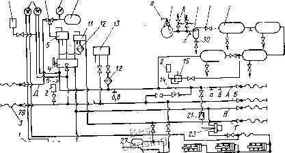 § 33. ПНЕВМАТИЧЕСКИЕ СИСТЕМЫ Тормозная система предназначена для приведения в действие тормозов. Воздухопроводы тормозов отечественных локомотивов имеют принципиально одинаковые пневматические схемы. Отличительными особенностями их являются лишь примененные тормозные приборы, выбор которых зависит от рода службы и наличия электродинамического тормоза. Тормозную систему тепловоза 2ТЭ116 (рис. 144) снабжают воздухом от компрессора 16 типа КТ-7, приводимого в действие от электродвигателя постоянного тока ЭКТ-5. Воздух подают в четыре главных резервуара 20 объемом по 250 л через регулятор давления 15, обеспечивающий в них давление 0,75-0,02 МПа. Для предотвращения превышения давления воздуха в главных резервуарах при отказе системы отключения компрессора на нагнетательной трубе компрессора установлено два предохранительных клапана 17, отрегулированных на срывное давление 1,07 МПа. Чтобы улучшить качество сжатого воздуха, т. е. обеспечить его очистку от примесей масла и влаги, имеется маслоотделитель 18. Осажденные масло и влагу сливают через кран 30. Перед электропневматическим клапаном 13 автостопа и краном вспомогательного тормоза воздух очищается дополнительно фильтрами 12. Обратный клапан 19 разобщает главные резервуары с тормозным компрессором при превышении давления в главных резервуарах под давлением в нагнетательной трубе компрессора. Для управления пневматическими тормозами в кабине машиниста установлен кран машиниста 5, кран вспомогательного тормоза, устройство 4 блокировки тормозов. Кран машиниста имеет уравнительный резервуар объемом 10-20 л. Манометр 9 предназначен для наблюдения за давлением в нем. Кран машиниста сообщается с тормозной и питательной магистралями через устройства блокировки тормозов, через него же сообщается кран вспомогательноготормозас магистралью вспомогательного тормоза. Давление в питательной и тормозной магистралях контролируют по показателям двухстрелочного манометра 7. Кран предназначен для независимого управления тормозами локомотива и обеспечения нормального действия автоматического тормоза при 228 16 17 13 19 20 ![]() 26 Z5 к 22 Рнс. 144. Принципиальная схема тормозной системы тепловоза: 13 - рукав соединительный; 2 - регулятор давления; 4 - устройство блокировки тормозов; 5 - кран машиниста; 6 - скоростемер; 7,9 - манометры; 8 - трехходовой кран; 10 - уравнительный резервуар; - кран вспомогательного тормоза; 12 - фильтр; 13 - клапан автостопа; 14, 19 - обратные клапаны; 15 - регулятор давления; 16 - компрессор; 17 - предохранительный клапан; 18 - маслоотделитель; рО - главный резервуар; 21, 23 - реле давления; 22 - тормозной цилиндр; 24 - воздухораспределитель; 25 - двухкамерный резервуар; 26 - пневмоэлектрнческий датчик; 27 - резервуар стабильности; 28 - запасной резервуар; 29 - концевой кран; 30 - спускной кран; А, Б - питательная и тормозная магистрали; В - магистраль вспомогательного тормоза; Г - магистраль блокировки тормоза; Д - трубопровод синхронизации работы кранов машиниста; а - отвод к воздуховоду управления и обслуживания; б - отвод к песочной системе; в - отвод к противопожарной системе; г - подвод от воздуховода управления и обслуживания обслуживании одним воздухораспределителем тормозных цилиндров тепловоза. Им можно усилить торможение тепловоза после действия автоматическим тормозом всего поезда до давления в тормозных цилинд