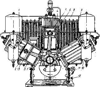 ![]() 8 § 3 § яГ о а, «« g я д 3 cj cj S R с О aji-ii-! к 3 §- 3" 3 о. «3 S с: s< о ![]() Рис. 146. Компрессор КТ6: / - клапанная коробка цилиндра низкого давления; 2 - поршень цилиндра низкого давления; 3 - цилиндр низкого давления; 4 ~ клапанная коробка цилиндра высокого давления; 5 - поршень цилиндра высокого давления; в - цилиндр высокого давления; 7 - узел шатунов; S - промежуточный холодильник; 9 - воздушный фильтр; 10 - маслоотделитель; - щуп; 12 - пробка горловины для аалнвкн масла; /3 - сапун ПО направлению движения воздуха в цилиндре - на прямоточные и непрямоточные; по числу рабочих сторон поршня - на одинарного и двойного действия. На форму компрессора, его размеры и расположение цилиндров существенно влияет компоновка локомотива. Ограничения по массе и габаритным размерам обусловили первоочередное развитие W- и V-образных компрессоров. Более 80% общего числа тепловозов и большинство электровозов оборудовали до последнего времени W-образИыми компрессорами КТ6 (рис. 146) и его модификации КТ7. Компрессоры КТ6, КТ7, КТбЭл поршневые трехцилиндровые двухступенчатого сжатия воздуха с промежуточным охлаждением его в холодильнике. Большая уравновешенность V-образных компрессоров позволяет принимать для них более высокую частоту вращения коленчатого вала и движения поршней, чем для W-образных, или при одинаковых для таких компрессоров частотах вращения вала выбирать большие размеры цилиндров. Это приводит в коне.чном итоге к снижению их массы. На тепловозах преимущественно распространены W-об-разные компрессоры. Это вызвано тем, что на них используют привод компрессора непосредственно от дизеля. Применяют строго определенные по расходу быстроходности, форме и габаритным размерам компрессоры. Номинальный расход их заведомо завышают и не используют. § 34. ПЕСОЧНЫЕ СИСТЕМЫ Песочная система служит для хранения и подачи песка под колеса с целью повышения сцепления движущих колес с рельсами. Необходимость в этом возникает при трогании локомотива с места, ![]() Рис. 147. Принципиальная схема песочной системы: / - форсунка; 2 - передний бункер; 3 - наконечник; 4, 5 - шланги; 6 - воздухораспределитель; 7 - разобщительный кран; 8 - электропневмовентиль; 9 - задний бункер ДЛЯ уменьшения опасности буксования, при следовании с составом в кривых, на подъеме или при резком торможении (во избежание юза), особенно если поверхности рельсов замаслены или влажны. На современных локомотивах наибольшее распространение получила песочная система с дистанционным электропневматическим управлением. В песочную систему входят: бункеры для хранения песка, электропневматические клапаны, воздухораспределители, форсунки, трубопроводы, электрическая система управления. Схема песочной системы локомотива (рис. 147). Песок подсыпают под крайние колесные пары каждой тележки, т. е. под четыре колесные пары. При движении локомотива песок на рельсы подают только под две колесные пары (передние по направлению движения каждой тележки). Управляют песочной системой при помош,и педали 9, расположенной в кабине машиниста. При нажатии на педаль песочницы замыкается электрическая цепь, и ток от источника питания поступает к контактам реверсора, а затем к катушке соленоида электропневмовентилей 8 переднего или заднего хода. Клапан электропневмовентиля 8 открывает доступ воздуха из питательной магистрали к воздухораспределите