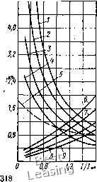 характеристикам подобных машин и представляют собой зависимости между величинами, отнесенными к их базовым значениям. Обычно в качестве базовых выбирают номинальные значения величин. Кроме того, из теории подобия известно, что электрические, магнитные, механические потери мощности в машине-модели должны составлять такую же долю от ее полной мощности, какую они составляют в машине-оригинале. Это условие не является определяющим, но из него следует, что для подобных машин зависимость tj/ti ( /оо) также близко совпадает. Справедливость этого положения подтверждают графики (рис. 182). Заштрихованная площадь - зона расположения графиков зависимости т1г/т1гоо (/г гоо), характеризующей тяговые генераторы тепловозов постоянного тока мощностью 700-2200 кВт. С незначительной погрешностью указанную зону можно заменить некоторой средней кривой /. Кривая 2 представляег собой ту же зависимость для синхронных тяговых генераторов тепловозов с учетом звена постоянного тока. При изменении тока генератора от до Iy, мощность генератора (в кВт) Р,-{/Л-10-». <68) Разделив, равенство (68)на равенство (61) и учитывая, что Реп = const и Рс = const, ПОЛуЧИМ Т1г/Т1гоо =(f/r/(/roo)-(/r roo) Ur = (Т1г/Т1гоо)/7г> (69) 317 где Vt = Uj-lUr и- /г = /г г<х, - относительные значения напряжения и тока генератора. Используя выражение (69), строят безразмерную требуемую внешнюю характеристику генератора (кривая 3, рис. 182) в зоне ограничения по мощности первичного двигателя. Для подобных машин зависимости ЦтЫгсо (/г) идентичны, следовательно, идентичны и зависимости Uj. (/р). На этом основании требуемую безразмерную внешнюю характеристаку тяговых генераторов тепловозов в зоне ограничения по мощности первичного двигателя относят к универсальным характеристикам. Напряжение на зажимах электродвигателя изменяется в соответствии с внешней характеристикой генератора. Кроме того, для расширения диапазона изменения силы тяги f„ и скорости движения V, в котором используется полная мощность дизеля, или для уменьшения массы генератора при заданном диапазоне изменения F„ и у осуществляют регулирование магнитного потока тяговых электродвигателей. Универсальными характеристиками тягового электродвига-теляч тепловоза (рис. 183) принято считать зависимости М (/) и ©2 (/) при постоянном коэффициенте возбуждения (а = const) и при регулировании напряжения на зажимах электродвигателя обратно пропорционально току нагрузки (в соответствии с требуемой внешней характеристикой генератора, кривая 3 на рис. 182). Эти характеристики имеют вид где М и Мое - текущее и длительное значения момента электродвигателя; соа и (йсВ - текущее и длительное значения угловой ![]() скорости якоря электродвигателя;. / и /оо - текущее и длительное значения тока электродвигателя; /в - ток возбуждения электродвигателя. В предварительных расчетах универсальные характеристики тяговых электрических машин используют для построения их действительных характеристик. Расчет требуемых характеристик тяговых электрических машин выполняют следующим образом. Рис. 183. Универсальные характеристики тягового электродвигателя: 1-4 - угловая скорость прн коэффициенте возбуждения а, равном соответственно 0,25; 0,38; 0,60 и 1,0; 5 - скорость движения прн U /U = 1.0 и а = 1,0; 6-9 - г/ гоо в крутящий момент при а, равном соответственно 1,0; 0,6; 0,38 и 0,25 1..Выбирают схему соединения тяговых электродвигателей и н