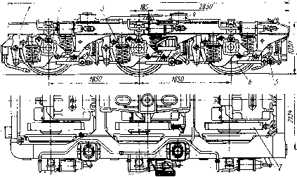 ГЛАВА in ТЕЛЕЖКИ § 13, КЛАССИФИКАЦИЯ И ТИПЫ ТЕЛЕЖЕК Тележки являются ходовой частью локомотива. При движении они испытывают сложные силовые воздействия: передают силу тяги на автосцепку, силу тяжести кузова на рельсы, а также силы, возникающие при торможении; воспринимают направляющие усилия при движении в кривых участках пути и силы, возникающие от неровностей пути. Поэтому от конструкции тележек в значительной степени зависят плавность хода и другие динамические характеристики локомотива.- Тележки должны обеспечивать безопасную эксплуатацию локомотива с максимальными скоростями движения, минимальные динамические усилия взаимодействия экипажной части и пути, полное использование сцепного веса. Они должны иметь минимальную необрессоренную массу, высокую надежность, хорошую ремонтоспособность и небольшую стоимость при изготовлении. Тележка современного тепловоза (рис. 38) состоит из следующих основных частей: рамы /, колесных пар 6, букс 2, рессорного подвешивания 3, опор 4 кузова, тягового привода 7 и тормозной системы 5. Для возврата тележки в среднее положение при повороте и относе ее оборудуют возвращающим и противоотносным устройствами. Нагрузка от кузова передается на путь через опоры, раму тележки, рессорное подвешивание, буксы и колесные пары. -Сила тяги, развиваемая колесными парами в опорной точке, передается через буксы раме тележки и далее на автосцепку, если она расположёна на тележке, или через раму кузова, если автосцепка установлена на этой раме. Тележки локомотивов классифицируют по выполнению рабочих функций, числу осей, типу рам, конструкции рессорного подвешивания, способу передачи крутящего момента на колесные пары, конструкции опорно-возвращающих и тяговых устройств и др. По выполнению рабочих функций тележки локомотивов разделяют на направляющие и движущие. Направляющие, или поддерживающие, тележки были широко распространены на паровозах. Назначение этих тележек сводилось к восприятию части нагрузки от весалокомотива и снижению динамического воздействия на рельсы "при прохождении движущих колесных пар. 56 ![]() Рис. 38. Тележка тепловоза 2ТЭ116: / - рама тележки; 2 - букса; 3 ~ рессорное подвешивание; 4 - опора кузова; 5 - тормозная система; 6 - колесная пара; 7 - тяговый привод Движущие тележки используют во всех современных локомотивах, и их главное отличие от направляющих тележек-возможность развивать силу тяги. По числу осей тележки делят на двухосные, трехосные и четырехосные. При этом четырехосные тележки можно формировать в одной раме или из двух двухосных, объединяя их межтележечной связью (промежуточной рамой). Увеличение числа осей тележки связано с ростом секционной мощности локомотивов. , По типу рамы тележки расчленяют на челюстные и бесчелюстные. В тележках первого типа рама имеет П-образные плоские направляющие, называемые челюстями и служащие для установки колесных пар параллельно друг другу. Эти направляющие обеспечивают передачу силы тяги и других горизонтальных сил от колесной пары на раму тележки. В тележках второго типа раму оборудуют кронштейнами, к которым крепят поводки букс. В этом случае упрощается конструкция рамы и уменьшается ее масса. В зависимости от конструкции рессорного подвешивания различают тележки двух групп: с индивидуальным и групповым рессорным подвешиванием. П