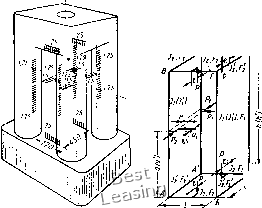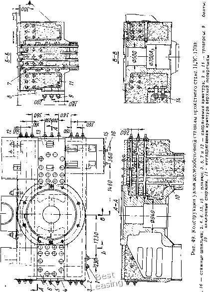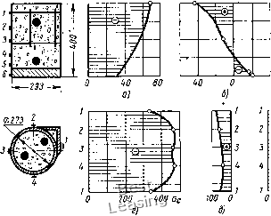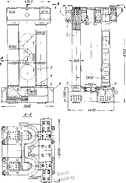 л.л л.л Рис. 45. Схема приложения и величины действующих эксплуатационных нагрузок на железобетонную клеть стана Рис. 46. Расчетные схемы железобетонной клети стана ние. Схема приложения и величины действующих эксплуатационных нагрузок на железобетонную клеть стана показаны на рис. 45. Железобетонная клеть прокатного стана представляет собой пространственную конструкцию. Клеть была рассчитана приближенным методом, путем расчленения пространственной конструкции на отдельные замкнутые плоские рамы. Расчетные схемы даны на рис. 46. Расчет сечений элементов клети выполнен в соответствии с СН и П [37]. Результаты расчета были проверены экспериментально при испытаниях клети. Деформации стоек при натяжении всех стержней на 35 т составили 0,225 мм, а деформации между опорными подушками - 0,267 мм. Разница в 0,042 мм получилась, по-видимому, за счет изгиба ригеля вследствие неравномерного обжатия стоек. При эксплуатационной нагрузке 50 т получены следующие деформации клети: растяжение стойки - 0,03 лл, прогиб ригеля - 0,01 мм и смятие бетона под опорной подушкой - 0,015 мм. При проектировании клети прокатного стана было поставлено условие, чтобы при эксплуатации клети упругие деформации не превышали 90 мк. 76 Деформация кежду опорными* подушками станин составляет 0,03 + 2 (0,01 + 0,015) = 0,080 мм. При увеличении вертикальной нагрузки до 100 т трещин в бетоне ригелей не обнаружено. Во время испытаний клети определяли напряжения во всех стойках и ригелях, при этом в стойках только в стальной оболочке, а в ригелях - в стальной оболочке ![]() гоо бс Рис. 47. Напряжения в сечениях ригеля и стойки: а, б, в-напряжения в среднем сечеинн ригеля соответственно от предварительного обжатия, от нагрузки 50 т, суммарная; г, д, е - напряжения в среднем сечении Стойки соответственно от предварительного обжатия, от нагрузки 50 т, суммарная И В бетоне. Полученные напряжения в среднем сечении ригеля станины и в среднем сечении стойки приведены в виде эпюр на рис. 47. В процессе прокатки вертикальная нагрузка на клеть меняется от Pin == 35 до Рп,ах = 50 т, а в момент захвата изделия валками от P„i„ = О до Pnjax = 50 т, т. е. клеть в процессе работы испы- тывает повторную нагрузку в двух режимах: при q = р""" = 35 О тах = -gQ- =0,7 и при Q = 50-- При этом оба режима повторяются по очереди один раз при прокатке каждой единицы изделия. Железобетонная клеть испытана на деформативность на многократно повторную нагрузку при 0,1 и 6 = 1 = 0,7. В результате испытаний железобетонной клети установлено, что после 18-10* циклов повторения нагрузок упругая деформация между опорными подушками станины равнялась 80 мк и прак- 6103 tHiJeckri не изменялась, а остаточная деформация составила Всего лишь 0,078 мм. При действии горизонтальных нагрузок упругая деформация между опорными подушками станин изменяется всего лишь на 1-2 мк, а поэтому можно считать, что горизонтальные нагрузки практически не влияют на деформацию клети и в расчетах их можно не учитывать. Напряжения от кручения в ригелях станины при эксплуатационных нагрузках малы: в стальной обшивке 10 кГ/см, в бетоне около 2 кГ/см. Следовательно, ригели станин можно не рассчитывать на кручение. За свой срок службы железобетонная клеть Кварто-200 может выдержать 12-10* циклов нагрузки. СТАНИНА КЛЕТИ ПРОКАТНОГО СТАНА „НЛС-1700" Монолитное выполнение узла станин клети стана Кварто-200 в железобетоне является преимущест