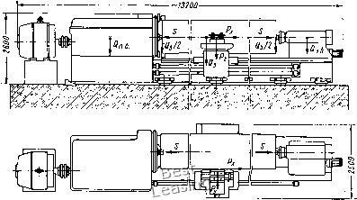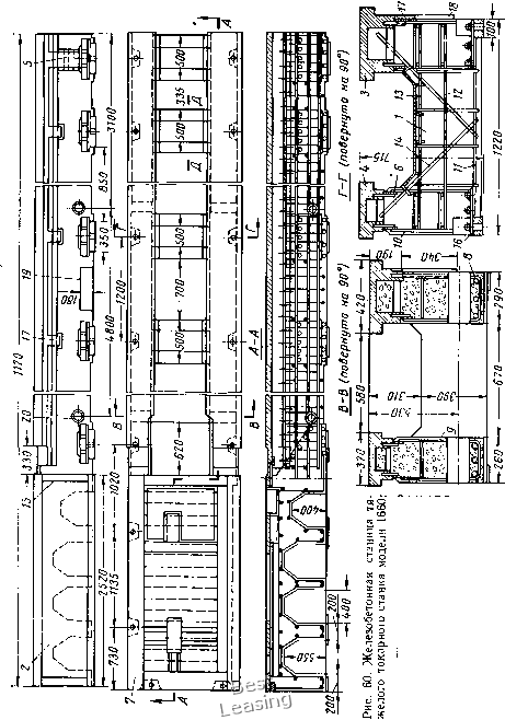 Из расчета на прочность видно, что напряжения в арматуре и бетоне при действии расчетных нагрузок не превышают допускаемых. Напряжения в растянутом бетоне аб.р = 7,84 <12,5/cr/cjtf2. Напряжение в арматуре составляет = 32,9 кГ/см, что значительно меньше допускаемых напряжений. Напряжение в сжатом бетоне равно 53,6 кПсм. Это ниже допускаемого для марки бетона М500. Из расчета на внецентренное растяжение следует, что станина армирована со значительным запасом, так как в большинстве случаев арматура поставлена конструктивно. Были проведены испытания станины для проверки расчетных данных. На станине в процессе эксплуатации, кроме сил от веса узлов, действуют силы резания: крутящий момент 6600 кГм, усилие подачи 42 500 кГ и изгибающий момент 37 ООО кГм. Действие этих нагрузок было заменено действием трех сил: распорной продольной силы; вертикальных сил, приложенных к направляющим попарно на расстоянии базы опирания каретки (1100 жж) и направленных у переднего торца каретки - вверх, у противоположного торца - вниз, и горизонтальной поперечной распорной силы, приложенной к круглым направляющим и равной 35 т. Изгибающий момент от горизонтальных сил приложен к направляющим. Распорная продольная сила равна 42,5 т (по расчету). Испытания велись по следующим схемам: при действии горизонтальной продольной распорной силы; при действии горизонтальной поперечной силы; при действии вертикальных сил; при одновременном действии горизонтальных и вертикальных сил. При достижении расчетной величины горизонтальных и вертикальных сил трещины в бетоне не наблюдались. Они не были обнаружены и при нагрузках, превышающих расчетные на 20%. Наиболее неблагоприятна горизонтальная продольная распорная сила, которая при действии на станину раскрывает стык и вызывает внецентренное растяжение. При действии горизонтальной поперечной распорной силы суммарная деформация балок, по экспериментальным данным, составляет 0,351 мм. Величина деформаций по уточненному рас-, чету составляет 0,36 мм, что совпадает с опытными данными (0,351 мм). Для чугунной станины расчетная суммарная деформация равна 0,384 мм. Это на 0,033 мм больше величины, получающейся для железобетонной станины и показывает, что последняя более жестка по сравнению с чугунной. Надежная связь торцовой плиты с бетоном при действии расчетных усилий обеспечивается существующей в конструкции анкеровкой. 100 При проверке действия вертикальных сил до 30 т, что значительно превосходит расчетные нагрузки, величина прогиба в пролете между опорами составляет 0,15-0,2 жж. Исходя из условий эксплуатации станка полученный прогиб допустим и существенного влияния на работоспособность не оказывает. При действии горизонтальной распорной силы (до 35 т) сум- марная деформация балок составляет 0,26 мм. Сильно влияет на деформацию балок жесткость средней части станины. При приложении вертикальных и горизонтальных сил суммарная деформация балок составляет 0,28 мм [Рд = 30 т\ Р = 35 т), что вполне допустимо по условиям эксплуатации станка. СТАНИНА ТЯЖЕЛОГО ТОКАРНОГО СТАНКА МОДЕЛИ 1660 Научно-исследовательский и проектно-технологический институт машиностроения (НИИПТМАШ, г. Краматорск) разработал проект железобетонной станины тяжелого токарного станка модели 1660. Железобетонная станина (рис. 60) представляет собой балочную монолитную транспортабельную констру