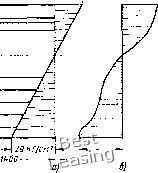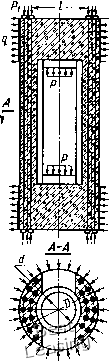 18 кГ/смг г/, к Г/см- -BOO- ![]() 3ltr/cn2 Рис. 71. Эпюры напряжений в модели шабота из обычного железобетона величины силы удара анкеровка плиты ненапряженной арматурой является недостаточно жесткой и анкеровку металлических закладных частей, по которым непосредственно производится удар, необходимо выполнять с помощью предварительно напряженной арматуры. На модели получено распределение напряжений по сечению под силой, при изгибе, величины которых приведены на рис. 71, а. 114 На рис. 71, б представлена расчетная эпюра распределения напряжений в том же сечении модели, из которой следует, что напряжения в бетоне, полученные экспериментально, близки к расчетным. Испытаниями модели железобетонного шабота 10-тонного штамповочного молота установлена работоспособность ее при приложении 2- Ю* циклов расчетной ударной нагрузки. СТАНИНА ПРЕССА ПЖБ-600 Железобетонная предварительно напряженная станина пресса ПЖБ-800, разработанная НИИЖБом совместно с ВНИИМЕТМАШем, представляет собой конструкцию, состоящую из четырех монтажных элементов: двух архитравов - верхнего и нижнего и двух стоек (рис. 72). Эти элементы при помощи продольной стержневой арматуры объединяются в пространственную конструкцию. Для повышения прочности и жесткости архитравов станины они выполняются в виде толстых железобетонных плит предварительно напряженных в двух направлениях. Предварительное напряжение бетона архитравов осуществляется навивкой по боковой поверхности элементов обоймы из высокопрочной арматурной проволоки диаметром 4 мм. Обойма состоит из трех сплошных рядов проволоки. Бетон для станины принят марки 500. В станине для крепления механических узлов пресса, распределения передаваемых на бетон сосредоточенных усилий и в местах сопряжения элементов предусмотрены металлические закладные части. Принятая форма цилиндрической станины обеспечивает достаточную жесткость конструкции при действии продольных и поперечных усилий. Железобетонные станины прессов цилиндрической формы при эксплуатации находятся в условиях сложного напряженного состояния. Схема нагрузок, действующих на цилиндрическую станину пресса, приведена на рис. 73. При эксплуатации стенки станины работают на внецентренное растяжение. Сечение стенок определяется в основном возможностью расстановки продольной рабочей напрягаемой арматуры станины, которая должна воспринимать усилия прессования. Для расчета стенок могут быть использованы положения СНиП [37]. 8* 115 ![]() Рис. 72. Железобетонная станина пресса ПЖБ-800 Архитравы станин являются наиболее нагруженными элементами. Их прочность и жесткость должны быть достаточны, чтобы передать рабочее усилие пресса на несущие растянутые стенки станины. Эксплуатационные усилия передаются на нагружаемую часть архитрава через ~j пирамиду штампов, распределяющих давле-а; ние до величины, безопасной для железо-I бетона. Величина рабочего усилия такова, что давление Р на бетон архитрава, распределенное под плитой, может достигать вели- чин, значительно превышающих кубиковую -1 прочность бетона. С противоположной сто- роны на опорной плоскости архитрава возникает реактивное давление анкеров продольной напряженной арматуры, передаваемое на бетон через толстые металлические шайбы, распределяющие давление. Реактивные усилия вызваны натяжением арматуры и д