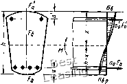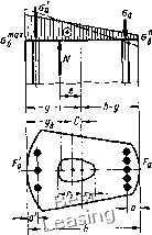 арматуры и бетона будут равны; модуль упругости бетона при напряжениях, не превышающих допустимых, постоянен и равен начальному модулю упругости. Напряжения в бетоне определяют по формуле Об = -р- 10б. пр], где - сжимающая продольная сила; = Fg + nFa - приведенная к бетону площадь сечения элемента; Fa я Fg - соответственно площади сечения арматуры (металла) и бетона сжатого железобетонного элемента; п = = --коэффициент приведения: [Об пр] = "Р - допускаемое напряжение бетона на сжатие. Напряжения в арматуре определяют по формуле где [о] = - допускаемое напряжение арматуры на сжатие. Расчетные" формулы для определения размеров поперечного сечения стойки выразятся следующим образом: (6) (7) [Об.пр] (I + «И-) Fa = ]F,, где ц - коэффициент армирования. Осевое растяжение. Допускаемое растягивающее усилие равно N = [a6.p]{F6 + nFa). (8) Напряжения растяжения в бетоне определяются по формуле Об. р = 7 < 10б. pJ- Площадь сечения бетона и арматуры рассчитывают по формулам: F. = -,, Л , (10) [Об. р] (1 + ПЦ) [Об. Fa - \yFs. Изгиб. Все однородные тела на изгиб рассчитывают на основании следующих допущений: соседние волокна не оказывают 22 друг на друга влияния; удлинения пропорциональны напряжениям (закон Гука); модуль упругости для всех волокон постоянный и не зависит от знака напряжений; плоское сечение при изгибе остается плоским (закон Бернулли). Для железобетона из этих допущений принимают только закон Бернулли. Сечение железобетонной балки при изгибе остается плоским, поэтому изменения длины волокон прямо пропорциональны расстояниям этих волокон от нейтральной оси. Так как для бетона не совсем справедлив закон Гука и зависимость между деформациями и напряжениями имеет нелинейный характер, то последние распределяются в сечении по кривой. При малых напряжениях эта кривизна незначительная и модуль упругости бетона при растяжении и сжатии почти одинаковый. Поэтому без особой погрешности эпюра напряжений в сечении может быть принята прямолинейной (закон Гука). При таких предположениях напряжения в железобетоне рассчитывают по общим законам сопротивления материалов так же, как и балки из однородного материала, причем различие модулей упругости стали и бетона учитывается заменой сечения стали п-кратным сечением бетона. Для сечения любой симметричной формы (рис. 7) выражения напряжений в бетоне и арматуре будут иметь вид ![]() Рис. 7. Расчетная схема сечения изгибаемого элемента Об = < [Об. J; J пр Об. р = -ji - х) < [об. р. и]; Оа =n-{h - х - а) < [oJ; j/tp м Оа = п -.- (х - а ) < J пр (12) (13) (14) (15) где Jnp - приведенный к бетону момент инерции относительно нейтральной оси (центра тяжести сечения). Положение нейтральной оси определяется из условия где S„p - приведенный к бетону статический момент относительно сжатой грани сечения. в выражениях (12), (13) и (14), (15) допускаемые напряжения определяют следующим образом: допускаемое напряжение бетона на сжатие при изгибе [Об. и] = допускаемое напряжение арматуры допускаемое напряжение бетона на растяжение при изгибе Величина К". „ не обусловлена строительными нормами. Но, как показали опыты проф. Б. Г. Скрамтаева, предел прочности бетона на растяжение при изгибе R,. „ у растянутого края бетонной балки, вычисленный по обычной формуле изгиба Rp.«= = в 1,7 раза больше предела прочности при осевом растяжении, согласно нормам. Поэтому допускаемые напряжения бетона на растяжение при изгибе целесообр