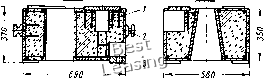 Рис. 86. Железобетонная подмоторная плита с салазками: /-салазки; 2-опорный узел; 3-скрытая монтажная петля Опорные узлы плиты состоят из металлических листов и приваренных к ним труб диаметром 1,5 дюйма. Трубы служат для пропуска фундаментных болтов и анкеровки в бетоне опорных листов. Для транспортирования плиты предусмотрены скрытые монтажные петли. Железобетонная плита (рис. 87) представляет собой также замкнутую раму. Узлы ее сопряжения с двигателем состоят из верхних платиков с отверстиями для болтов и коробок из тонкого листа, образующих в теле плиты ниши для свободного доступа к головке болта. Верхние платики анкерятся в бетоне при помощи стержней из горячекатаной арматуры периодического профиля, приваренных к ним впритык. Опорные узлы состоят из уголков, к которым приварены металлические бобышки с отверстиями для анкерных болтов и верхних листов, образующих ниши. Для транспортирования железобетонной плиты предусмотрены рым-ные пуговицы, которые приваривают к металлическим пластинам и анкер ят в бетоне. Арматурный каркас плиты состоит из плоских каркасов, которые собирают при помощи сварки и связывают закладные части в единое целое. Рабочая арматура состоит из стержней горячекатаной арматуры периодического профиля диаметром 12 мм, а монтажная - из круглой диаметром 6 мм. Плита привода (рис. 88) служит опорой для электродвигателя и редуктора. Она выполнена в виде Г-образной плиты сплошного сечения. Узлы сопряжения плиты с двигателем представляют собой металлические сварные конструкции коробчатого типа, образующие в теле плиты ниши для заводки болтов и свободного доступа к их головкам. Узлы сопряжения плиты с редуктором ![]() Рис. 87. Железобетонная подмотор-Л ная плита с карма-нами: J / - карман; 2 -рым-Ё ная пуговица; 3 - опорный узел представляют собой металлические опорные пластины с гнездами -для размещения головок болтов. Головка болта входит в паз, предохраняющий его от проворачивания при затяжке. Для крепления защитных кожухов привода в плите предусмотрены металлические закладные части, заанкеренные в бетоне при помощи коротышей периодической арматуры, и металлический сварной кронштейн. Нижние опорные узлы выполнены в виде металлической конструкции, состоящей из опорной плиты с отверстием под анкерный болт, промежуточного платика толщиной 10 мм и кармана под ключ из тонкого листа. Анкеровка опорных узлов осуществляется сваркой их с арматурным каркасом. Для транспортирования плиты предусмотрены рымные пуговицы. Рабочая арматура равномерно распределена по всему сечению плиты. Нижнюю арматуру сваривают в каркас и соединяют с платиками опорных узлов. Верхняя арматура представляет собой сетку с ячейкой 150x150 мм. Вертикальные стержни связывают верхнюю и нижнюю арматуру в пространственный каркас. 134 Железобетонные плиты исследовали, чтобы изучить надежность соединения узлов сопряжения плит с двигателем и опорных узлов с бетоном при максимальных нагрузках. Испытывали железобетонную подмоторную плиту под двигатели типа МТК и МТ с максимальным крутящим моментом до 156 кГм. Учитывая, что в настоящее время промышленность пере- -1050 -380- о 1 -* ![]() Рис. 88. Железобетонная плита привода шла на выпуск вышеуказанных типов двигателей с увеличенной в 1,5 раза мощностью при тех же габаритах, прилагая нагрузку, исходили из момента, ра