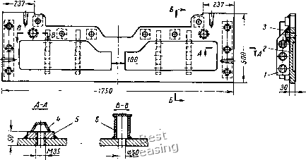 ![]() Рис. 102. Торцовый платик: /-ребро; 2 - лист; 3 -бобышка; 4 -желоб; 5 - платик; 6 - стакан ![]() Рис. 103. Опалубка железобетонной станины: / - стяжной брус; 2 ~ клин; 3 - боковой щит; 4 - основание; 5-брус; 6 - ящик для образования пустоты Щиты опалубки крепили с помощью деревянных клиньев. Арматурный каркас для упрощения его изготовления был разбит на ряд элементов. Каждый элемент каркаса - нижняя его часть, рабочая сетка и т. д. - изготавливался отдельно. На монтаж и сборку опалубки, металлических закладных частей и арматурного каркаса был разработан подробный технологический процесс с указанием времени на каждую операцию (см. приложение, табл. 2) Монтаж закладных частей в опалубке начинали с установки на деревянные бруски направляющих, которые выверяли и закрепляли на стенде. Затем монтировали торцевой платик, который устанавливали непосредственно на направляющие. При этом контролировали прилегание опорных мест торцевого платика к направляющим ![]() Рис. 104. Соединение торцового платика с направляющей: / - торцевой платик; 2 - косынка; 3 - направляющая ![]() Рис. 105. Анкеровка заднего платика И перпендикулярность его к плоскости стенда. Для обеспечения жесткости соединения к направляющим и торцовому платику приваривали косынки (рис. 104). После этого устанавливали задний платик и платики под упоры каретки. 170 Наиболее трудоемким оказался монтаж металлической облицовки, которая своими краями упирается в вертикальные стенки направляющих. Во избежание деформаций облицовку к направляющим приваривали прерывистым швом. Для лучшего прилегания облицовки к направляющим ее нагружали сверху. Сливную трубу приваривали к облицовке таким образом, чтобы вырез в трубе и отверстие в облицовке совпадали. Монтажные арматурные работы начинали с приварки анкерных стержней к платикам, торцовому платику и облицовке. ![]() Рис. 106. Изготовление металлического каркаса железобетонной станины Затем к вертикальным стенкам направляющих приваривали хомуты. Для усиления анкеровки заднего платика, воспринимающего большие сдвигающие усилия в процессе эксплуатации станка, к нему приваривали два наклонных стержня (рис. 105). Далее следовала установка рабочей сетки, нижней части каркаса, вертикальных стержней внутренних балок; приварка гнутых стержней к рабочим продольным стержням каркаса, к торцовому платику и монтаж труб для транспортирования (рис. 106). Сборка опалубки заключалась в установке боковых щитов, деревянного упора под задний платик и соединительных брусков с клиньями. Бетон в конструкции уплотняли ручными вибраторами. После бетонирования станины подвергались термовлажностной обработке. На рис. 107 изображены секции железобетонной станины в пропарочной камере (опалубка снята), а на рис. 108 показана погрузка секции. Лосле изготовления станины подвергались механической обработке. В отличие от механической обработки чугунных станин 0 1 2 3 4 5 6 7 8 9 10 11 12 13 14 15 16 17 18 19 20 21 22 23 24 25 [ 26 ] 27 28 29 30 31 32 33 |
