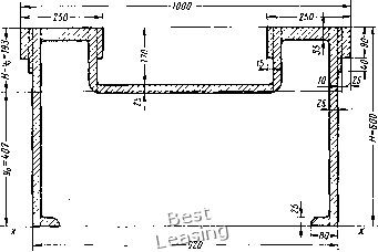 Определим прогиб железобетонной станины от расчетных нагрузок: mp 728000-5502 !ж.б = 8EJ„p 8-0,4-10»-1174891 = 0,0585 см. Для определения жесткости / найдем силу Р, которую необходимо приложить к станине в виде сосредоточенной нагрузки посредине пролета, чтобы получить прогиб /яс. б , РР Гж.б = - откуда 48EJ /.б48£7 0,0585-48.0.4-10"-1174891 Следовательно, 1ж. 6 = QQQQ-g = 13 555 кГ/мм. ![]() Рис. 15. Сечение чугунной станины Те же операции проведем для чугунной станины, предварительно определив центр тяжести ее сечения (рис. 15) и момент инерции: 2-2,5-9-55,5 + 2-1-13-53,5 + 2-2,5-60-30 + + 2-15.3,5-58,25 + 2.2,5-19,5-50,25 + 2-1,5-9-55,5 + S +53-2,5.41,75+ 2-5,5.1,25-2,5 F 2.2,5-9 + 2-1-13 + 2-2,5-60 + 2-15-3,5 + 2.2,5-19,5 + + 2-1,5-9 + 53-2,5 +2-5.5-2,5 = 40,7 см. J = + 2-2,5-9-14,8 + + 2-1 -13-12.8 + ц + 2-2,5-60-10,72 + 2d + 2 • 15 - 3,5 -17,552 + + 2-2,5-19,5-9,552+ :М: +2-1,5-9-14,82+ + 53-2,5-1,052+ ; +2-5,5-2,5-39,452 = 232 178 см; 8000-86,3-5502 8.1,3.10-232178 -O-OSei 1ч = 7500 0,86 = 8730 кГ/мм < /ж. б = 13 555 кГ/мм: Жесткость железобетонной станины в 1,55 раз выше чугунной. ГЛАВА II КОНСТРУИРОВАНИЕ ЖЕЛЕЗОБЕТОННЫХ ДЕТАЛЕЙ МАШИН ИСХОДНЫЕ ПОЛОЖЕНИЯ ПРОЕКТИРОВАНИЯ В машиностроении может быть осуществлена замена существующих металлических базовых деталей железобетонными и новое проектирование машин и станков. Характерной особенностью замены металлической детали железобетонной является повторяемость форм и размеров. Иными словами, применение железобетонной детали не должно вызывать изменение конструкций или доработку сопрягающихся с базовой деталью узлов машины. Заданием на проектирование железобетонной детали в этом случае служит рабочий чертеж металлической детали, в котором указаны точность и чистота механической обработки; допускаемые отклонения от взаимного расположения рабочих плоскостей; требования, предъявляемые к материалу и внещнему виду детали. Чертежи узлов и общих видов дают представление о положении базовой детали в машине или станке, о конструкции присоединяемых к базовой детали узлов и механизмов и их взаимодействии в период работы машины. Таким образом, конструктор, приступая к проектированию железобетонной детали взамен существующей металлической, располагает достаточными исходными материалами. Следует отметить, что требование повторения геометрических форм и размеров металлической детали затрудняет применение унифицированных и типовых конструкций закладных частей и арматурных каркасов. Некоторые формы металлических деталей оказываются неприемлемыми для исполнения их в железобетоне. Новые железобетонные базовые детали проектируют на основе руководящих материалов. Основные размеры деталей выбирают с учетом требований к железобетонным конструкциям и основных свойств железобетона. Расчетом определяют размеры поперечных сечений, обеспечивающих необходимую жесткость и прочность конструкции. Базовым деталям машин присуще большое разнообразие форм поперечных сечений, габаритных размеров и конструкций. Базовые детали можно разделить на следующие группы. По назначению: станины и стойки, имеющие направляющие движения; плиты, основашгг кг рамы; блоки и шаботы; станины прессов и листоправйльных машин, имеющих замкнутый контур; цилиндры, барабаны, ролики и плунжеры; балки, траверсы, перекладины и ползуны. По форме: детали, у которых один габаритных размер значительно больше, чем два других (станины станкрв, траверсы, стойки, балки и т. д.); детали, у которых один габаритный размер меньше, чем два других (фундаментные плиты, блоки); детали, им