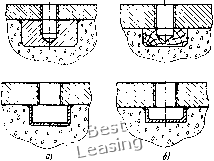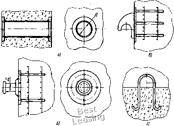 целесообразно толщину металлической части назначать равной длине резьбы, а выход сверла в бетон предупреждать постановкой платика или деревянного бруска (рис. 23, б). При заданных координатах в местах отверстий заранее предусматривают бобышки или металлические стаканы, размеры которых назначают с некоторым запасом, компенсирующим возможные отклонения при сверлении отверстий. Если координаты отверстий не заданы и они выполняются при сборке, возможные отклонения в положении отверстий учитывают платиком больших размеров или желобом (рис. 23, в). ![]()