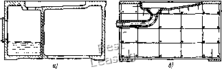 ![]() i:a : t i;----Рис. 23. Виды отверстий в железобетонных деталях При замене материалов, например чугуна на сталь, необходимо производить перерасчет длины резьбы, чтобы обеспечить прочность и надежность соединения при минимальных длинах резьбы. Конструирование масЛяных ванн в железобетонных деталях. Масляные ванны многих машин размещены непосредственно в ба-=зовой детали, например в рамах рольганга с групповым приводом или станинах тяжелых токарных станков. Совмещение масляных ванн с базовой деталью делает машину компактной. Масло неблагоприятно действует на бетон, поэтому конструктор должен принят меры по его защите. На рис. 24, а показан пример конструктивного решения масляной ванны в металлической детали. При железобетонном исполнении базовых деталей масляную ванну выполняют ввиде сварного бака, который размещается внутри конструкции (рис. 24, в). Хомуты и рабочие стержни каркаса можно приваривать непосредственно к баку. Такое размещение маслобаков значительно усложняет монтаж каркаса в опалубке и бетонирование конструкции (при значительных размерах бака приходится смещать и разрезать рабочие стержни, из-за чего образуются труднодоступные места). 52 Другим вариантом является выНесёййе масляного бака за пределы конструкции. В этом случае в железобетонной детали предусматривается маслосборник и сливная труба (рис. 24, б). Маслонасос с фильтром монтируют непосредственно на крышке бака. В железобетонной станине предусматривается маслосборник, совмещенный со сварной передней плитой и сливной трубой, выходящей наружу, которая соединена с баком. Вариант размещения масляной ванны выбирают исходя из конструкции железобетонной детали и ее габаритных размеров. ![]()