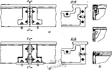 Рис. 24. Конструктивное решение масляных ваин в металлических и железобетонных деталях машин Стыковка железобетонных деталей. В зависимости от габарита и веса железобетонные детали выполняются монолитными или сбор но-монолитными. В первом случае бетонируют одновременно всю деталь в единой опалубке. Во втором случае деталь разбивают на отдельные элементы, которые изготовляют заранее и собирают на монтажной площадке. Такое членение железобетонных и металлических деталей вызвано технологическими возможностями заводов-изготовителей, которые не в состоянии отлить или забетонировать крупногабаритные конструкции. Например, станины станков длиной до 25 м изготовляют по секциям. Кроме технологических, часто встречаются конструктивные стыки. Например, стыкуют стойки и поперечину карусельного станка, станину к шпиндельной бабке некоторых специальных станков, станину и траверсу листоправйльиых машин. Основным требованием, предъявляемым к стыку, является жесткость, которая должна быть не менее жесткости стыкуемых элементов. В таком случае деталь рассматривают как монолитную конструкцию. Технологические и конструктивные стыки металлических деталей осуществляются тщательной пригонкой стыкуемых торцев, затяжкой болтами и фиксацией штифтами или шпонками. Торцы фрезеруют чисто, а затем шабрят. Шабровкой добиваются прилегания плоскостей. Качество стыковки тщательно контролируют, так как от этого зависит жесткость стыка. В зазоры стыков секций станин, например, не должен проходить щуп 0,05 мм на глубину более 25 мм. На рис. 25, а показан стык чугунных станин. ![]() Рис. 25. Стыковка металлических и железобетонных деталей машин и способы соединения стыковочной плиты с направляющими Стыки железобетонных деталей по конструкции аналогичны металлическим (рис. 25, б). Торцовая стенка стыкуемого элемента снабжается металлической плитой соответствующей толщины, которая прочно соединяется с бетоном. Толщина чугунной плиты назначается в пределах 30-50 мм, а остальной - 20-30 мм. На рис. 25, в показаны способы соединения металлической торцовой плиты с направляющими. Транспортировочные устройства. Для транспортирования и кантования железобетонных деталей предусматривают специальные устройства. Наиболее распространенным является труба, размещенная в массиве бетона и соединенная с ним с помощью анкерных стержней. Трубы применяют в деталях весом до 20 т и выше. Диаметр труб выбирают в пределах 80-120 мм (рис. 26, а). Для транспортирования деталей весом до 5 m на ней предусматривают рымные болты и пуговицы, заанкеренные в бетоне (рис. 26, б). Вместо рымных болтов и пуговиц можно использовать крюки (рис. 26, в). 54 Кроме перечисленных выше транспортировочных устройств, можно применять монтажные петли из стальной горячекатаной гладкой арматуры Ст. 3 (рис. 26, г). Монтажные петли применяют в деталях, не подвергающихся каитовке в процессе обработки и монтажа. Направляющие движения. Многие базовые детали снабжены направляющими движения (станины листоправйльных машин, станины металлорежущих станков, прессы, станины дисковых -ножниц). ![]() Рис. 26. Транспортировочные устройства в железобетонных деталях машин Направляющие являются наиболее ответственной частью конструкций. Они выполняют роль базовых поверхностей, по которым перемещаются узлы машин. Основным требование