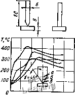 Примечание. I - очень \ороиая свариваемость, 2 - хорошая, 3 - удовлетворительная, 4 - низкая. материале, применяют сварку ультразвуком в дальнем поле с разделкой кромок 6, 31). При сварке деолей с V-образной разделкой кромок их оптимальные размеры по высоте рассчитываются исходя из условий h= (2т + \)Х1А + Xoi; а/2; Х„,= (Л/2я)агс1о (~2nlSJXS.), где /]- длина верхней детали (без V-образного клина); 1- длина V-образного клина верхней детали; 5]- плошадь поперечного сечения верхней детали; i- площадь контакта V-образного клина с нижней деталью; m = О, 1, 2, ...; fe = О, !, К.., Хп- смещение максимума силы относительно верхней детали. Наличие разделки кромок оказывает существенное влияние на кинетику образования соединений. рн V-образной разделке кромок сварка ведется по схеме с «преимущественным внедрением» или «преимущественным оплавлением». На рис. 56 и 57 рассмотрена кинетика образования соединений капролона В по схеме с «преимущественным внедрением» и «оплавлением» с оптимальными углами разделки верхней детали. Соединения, Сваренные по схеме «оплавлением», характеризуются высокой прочностью и могут использоваться при изготовлении деталей, подвергающихся значительным нагрузкам в процессе эксплуатации. Эти схемы сварки дают возможность соединять разнородные пластмассы. Применение схемы «внедрением» дает возможность образовывать соединения несовместимых по своим теплофизическим свойствам полил!ерных материалов за счет чисто механического сцепления (капролон В с полистиролом, капролон В с полиметилметакрплатом и др.). Прн атом обязательно должен внедряться образец с большим модулем упругости, Сварка деталей из жестких пластмасс малых толщин, у которых отсутствует разделка кромок, осуществляется путем введения мягкой прокладки мелчду соединяемыми деталями. Прокладкой может служить как материал самого изделия после предварительного подогрева, так н др;гой полимер. Мерой концентрации энергии на прокладке служит безразмерный коэффициент = E{c\jE\r\\, где Е{ и £2-модули упругости соответственно верхней двтвли и прокладки; rii и -коэффициенты механических потерь соответственно верхней детали и прокладки (т] =- £"/£, £"- модуль потерь) [4]. Концентрацию энер-гин на прокл.тдке можно увеличить, уменьшая отношение £2/tlj. ш зво 200 100 I I 1 2 3 5 t,C ![]() I 2 3 4 S t.c Рис. 56. Кинетика образования соединений по схеме «с преимущественным внедрением». Материал - капролон В (Л = 45 мкм; Р = 220 Н/см; а, б, в - места расположения термопар) Рис. 57. Кинетика образования соединений по схеме с «преимущественным оплавлением» (Л = 45 мкм; Р = 900 Н/см; а, б, в - места расположения термопар) Дополнительные требования к прокладке; температура плавления или перехода в вяйкотекучее состояние материала прокладки должна быть ниже, а ин.хекс текучести расплава выше, чем свариваемого материала; материал прокладки должен быть кимически совместимым со свариваемым материалом; оптимальная толщина прокладки должна составлять 0,05-0,1 мм. Сварку ультразвуком ориентированных пленок осуществляют скользящим инструментом, имеющим клинообразную форму. При использовании обычных методов сварки ориентированная структура пленок в зоне шва разупорядочивается и прочностные характеристики шва сильно ухудшаются. Отличительной особенностью ультразвуковой сварки скользящим инструментом является то, что нагрузки на инструмент требуются неб