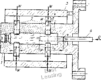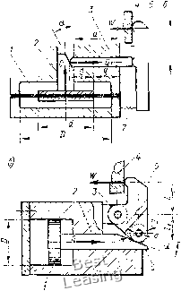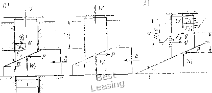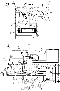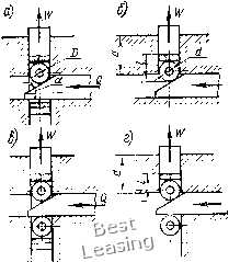 Клиноплунжерные механизмы-усилители. Одно- и двухплунжер-ные механизмы применяют как усилители привода приспособлений, многоплунжерны.е механизмы - как центрируюихие механизмы патронов, оправок. На рис. III.24, а дана схема механизма с односкосым клином и двухопорным плунжером без роликов. Рассмотрим равновесие плунжера, а не клина и найдем зависимость между силой зажима W и исходной силой Q привода. При равновесии плунжера P=N; W==W,-F,=W,-Ntgf,. ![]() Рис. III.24. Схемы для расчета клиноплунжерного механизма с двухопорным плунжером (а) и с консольным плунжером (б) Заменив в формуле Лна Р, получим U7 = ri-Ptgtp3. Значения Wi и Р определяются по формулам: W,=Q- tg (а-f-?i) 4-tg ?2 Подставим значения Wi и Р в формулу равновесия плунжера: 1 1 Q -tg(a+cpi)tgtp3. tg (а-f-<pi) 4-tg ?2 " tg (a 4-?i)-f-tg 2 После преобразования получим окончательную формулу tg (а 4-?i) 4-tg f 2 Для механизма с односкосым клином и консольным -плунжером (рис. III.24, б) силу зажима W определяют по приведенной формуле, но в формулу вместо коэффициента трения tg(f3 подставляют приведенный коэффициент трения tg93np: W-Q 1 -g(" + y)gy3np tg(a + ?i) + tg?2 Замена tgrps па tgфзпp объясняется тем, что условия трения консольного плунжера отличаются от двухопорного плунжера. Значение коэффициента трения 1дфзпр можно определить при рассмотрении сил, действующих на консольный плунжер (рис. III.24, б). Сила Р создает перекос плунжера, т. е. она стремится повернуть его относительно средней точки О (на величину зазора) и создает давления, распределенные в виде треугольников. Равнодействующие N этих давлений находятся от вершин треугольников на расстоянии (1/3) а; а расстояние между равнодействующими силами N равно (2/3) а. Значение приведенного коэффициента трения tgфзпp «айдем при равновесии плунжера, когда моменты сил Р и N относительно точки О равны. Следовательно, PlN {2,3) а. Подставим в равенство значение N: тогда P/ = (/3,tgT3)(2/3)a 2/3=P(3 a)tg=p3 = /tgcp3np, откуда tg?3„p=(3 a)tgcf3. Здесь а -угол наклона плоскости клина; d -диаметр оси ролика, мм; /) -наружный диаметр ролика; d/D = 0,5; / - расстояние от средней точки контакта консольного плунжера с клином до середины направляющей плунжера; а -длина направляющей консольного плунжера; а = 0,7; tgфз -коэффициент трения двухопорного (неперекошенного) плунжера; фз -угол трения двухопорного плунжера; ig(f2 - коэффициент трения на горизонтальной плоскости клина; ф2 -угол трения на горизонтальной плоскости клина; ф1 - угол трения на наклонной плоскости клина; в основном углы трения равны, т. е. ф1 = ф2=фз. На рис. III.25, а-г даны четыре схемы клиноплунжерных механизмов с одним плунжером и роликами. Для таких механизмов сила зажима W=Q ~g23 tg(a-f-?i) + tg?2 но с заменой угла и коэффициентов трения приведенными коэффи-центами фщр, tgф2пp и tgфзпp: для механизма (рис. 111.25, а) с двухопорным плунжером и одним роликом в формулу вместо ф подставляют приведенный угол трения ф1пр= arctg tgфl(d/D), tg фшp = tgфl(d/D) и тогда формула примет вид W=Q - (" + fi пр) tg ?з . tg(a+ifi„p)tgif2 для механизма (рис. III.25, б) с консольным плунжером и одним роликом в формулу вместо угла ф1 и 1§фз подставляют фщр и tg(fзпp = tgфз (3 с) и формула примет вид \у/ц -g(«+ Pi..p)tgtp3(3 a) . tg(a + -finp) + tgtp2 для механизма (рис. 111.25, в) с двухопорным плунжером и двумя роликамиВ формулу вместо ,ф1 и tgф2 подставляют фшр и tgф2пp = tgф2(cf/D) п формула примет вид 1 -tg(a-f yi,.p)tgy3 . ![]() W = Q для механизма (рис. III.25, г) с консольным плунжером и двумя Q роликами в формулу вместо ф], tg ф2 и tg фз подставляют их приведенные