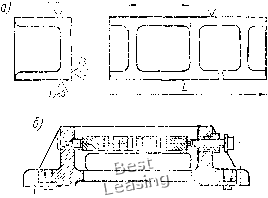 [tg(a + tgy2] . iL. - [I -tg(a + ?i)(g?3np] -n Здесь tg92 = f=0,1-коэффициент трення на направляющей поверхности штока; h и / - длина плеч рычага; а -длина втулки направляющей плунжера; Q -исходная сила на штоке привода. На рис. И1.28, б дана схема зажимного устройства с прихватом и пневматическим приводом. При подаче сжатого воздуха в бесштоковую полость пневмоцилиндра поршень / со штоком 2 перемещается вправо. Шток 2 клиновым концом, нажимая на ролик 6, сидящий на оси прихвата 5, поворачивает его около оси 3, и прихват верхним плечом зажимает деталь 4. Во время подачи сжатого воздуха в штоковую полость поршень / со штоком 2 перемещается влево и клиновой конец штока 2 прекращает нажим на ролик 6. При этом прихват 5 вследствие более тяжелой нижней его части поворачивается около оси 3 и деталь разжимается. Для такого устройства сила зажима W= Q 1 - tg (g + 91 пр) А т]. tg (а + tpi ир) + ig 92 I Здесь ф1пр - приведенный угол трения на скосе клина; ф1пр== = arctgf(rf/Di); /=0,1- коэффициент трения; -диаметр оси ролика, мм; Di - диаметр ролика, мм; tgф2 -коэффициент трения в направляющей поверхности клина; т] = 0,9 - коэффициент, учитывающий потери иа трение в пневмоприводе. ГЛАВА IV КОРПУСА И ВСПОМОГАТЕЛЬНЫЕ ДЕТАЛИ ПРИСПОСОБЛЕНИЙ § IV.1. Корпуса приспособлений Корпус приспособления является базовой деталью. На корпусе монтируют зажимные устройства, установочные элементы, детали для направления инструмента и вспомогательные детали. Форма и размеры корпуса нриспосойления зависят от формы и габаритных размеров обрабатываемых в приспособлении деталей н расположения установочных зажимных и направляющих деталей приспособления. Действие сил зажима и сил резания, воспринимаемое обрабатываемой деталью, закрепленной в приспособлении, передается корпусу приспособления. Поэтому корпус приспособления должен быть достаточно жестким, прочным и обеспечивать быструю, удобную установку и снятие обрабатываемых деталей. К корпусу должен быть удобный доступ для очистки его установочных-элементов от стружки, быстрой и правильной установки приспособления на столе станка (на корпусе имеются направляющие детали или по- ![]() Рис. IV.!. Элементы корпусов для крепления приспособлений на столе стайка верхности). При соблюденпп всех технических требований трудоемкость изготовления корпуса и его себестоимость должны быть минимальными. Правильная установка приспособления «а столе станка без выверки производится с помощью направляющих шпонок, закрепленных на нижней установочной плоскости корпуса приспособления. Направляющие шпонки в.ходят в Т-образный наз стола станка и обеспечивают правильную ориентацию корпуса приспособления. Корпус 1 приспособления (рис. IV. 1) крепится на столе 3 станка болтами, которые головками входят в пазы 4 стола, а верхним концом с гайкой входят в проушины 2 корпуса приспособления. Корпуса приспособлений изготовляют как цельными, так и сборными. Цельные корпуса изготовляются литыми из серого чугуна, сварными из стали. Для литых корпусов при.меня-ют чугун марки СЧ 18-36 по ГОСТ 1412-70 и чугун СЧ 32-52. Корпуса нестандартные изготовляют из чугуна марки СЧ 12-28, стали марки СтЗ и из алюминиевых сплавов. Сборные корпуса изготовляют методом сборки или сварки из отдельных стандартных элементов корпусов (ГОСТ 12947-67, 12961-67), из которых можно получать различные конструкции корпусов. Отдельные составляющие элементы корпус