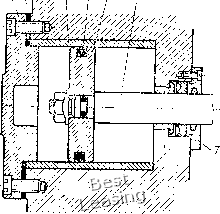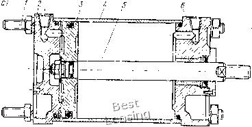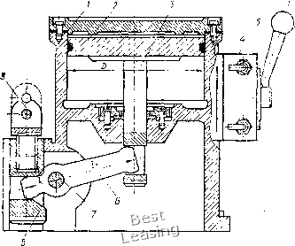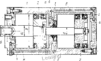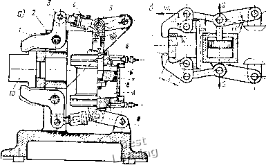 лым штоком применяется при обработке деталей из прутка пли трубы на токарных и револьверных станках. Стационарные пневмоцилиндры. Стационарными называют пнев-моцилиндры, корпус которых жестко закреплен на приспособленииг Они предназначены для механизации и автоматизации станочных приспособлений, pfa стационарные пневмоцилиндры двустороннего действия в машиностроении установлен ГОСТ 15608-70. ![]() 5) t 2 J 4 5 6 ![]() Рис. V.5. Стационарный пневматический цилиндр: а - схема: i скрепляющие шпильки; 2 - задняя крышка; 3 - поршень; - гильза, 5 - шток, о - передняя крышка; б - компоновка; / - крышка цилиндра, 2 - прокладка, 5 - гильза, 4 -резиновое кольцо, 5 ~ поршень, 6 ~ шток, 7 - крышка По способу крепления к приспособлениям пневмоцилиндры подразделяют на четыре типа: с удлиненными стяжками, с фланцевым креплением, с лапкамн, с шарнирным креплением. На рис. V.5, а показан стационарный пневмоцилнндр, который крепится к корпусу приспособления удлиненными стяжками. Сжа- тый воздух подается в полости цилиндра через штуцера, которые завинчены в резьбовые конические отверстия крышек 2 и 6. На рис. V.5, б дана компоновка встроенного пневмоцилиндра. В чугунный корпус приспособления запрессовывают стальную или латунную гильзу 5, являющуюся корпусом пневмоцилиндра. Встроенные пневмоцилиндры применяют в специальных и переналаживаемых приспособлениях с небольшими габаритными размерами. ![]() Рис. V.6. Пневмоцилиндр двустороннего действия с двумя поршнями на общем штоке На рис. V.6 показан сдвоенный стационарный пневмоцилиндр с двумя поршнями на одном штоке. Такой пневмоцилиндр при рабочем ходе поршней создает осевую силу на штоке, примерно в 2 раза большую по сравнению с пневмоцилиндром с одним поршнем такого же размера. Корпус 1 пневмоцилиндра разделен перегородкой 3 на две части. На корпусе винтами закреплены крышки 4 и 6. При подаче через штуцер в отверстие б сжатый воздух расходится по каналам а, в, г корпуса и, поступая в правые полости цилиндра, давит на поршни 2, 5 н перемещает их влево. В случае подачи через штуцер в отверстие е сжатый воздух расходится по каналам д, ок, и корпуса и, поступая в левые полости цилиндра, перемещает поршни вправо. Диаметры цилиндров D, штоков d и величины ходов / установлены по ГОСТ 6540-68: D=160-320 мм; =32, 45 мм; / = 32, 40 мм. Цилиндры с двумя и тремя поршнями на одном штоке применяют в качестве пневмоприводов для стационарных и вращающихся приспособлений, когда требуется при небольшом диаметре цилиндра получить большую силу на штоке, а конструкция станка или приспособления не позволяет применить пневмоцилиндр большего диаметра. Сила на штоке пневмоцилиндра с двумя поршнями (см. рис. V.6) при толкающем движении поршней со штоком влево определяется по формуле Q==(.Tt/4)(2D2-flf2);,n. Прп тянущем движении поршней со штоком вправо сила на штоке: 3 А ![]() ![]() ![]() Рнс. V.7. Пневмоцилиндр двустороннего действия с двумя независимо перемещающимися порщнями С одинаковым диаметром штока Q = (jt/2)(D2-rf2),n; с разными диаметрами штока Q = (jt/4)(2D2-rf2 cf2),ri, где D -диаметр поршня пневмоцилиндра, см; rf, - диаметры штока в полостях цилиндра, см; р = 0,4 -давление сжатого воздуха, МПа (р = 4 кгс/см2); 11 = 0,85-0,9 -КПД пневмоцилиндра. Если требуется одновременно привести в действие два независимых зажимных устройства приспособления, применяют вращающийся пневмоцилиндр (рис. V.7) с двумя поршнями 4 я 5, закреп- ленными на 