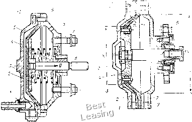 воздуха, МПа (обычно р = 4 кгс/см); г =/i - передаточное отношение плеч рычага-усилителя; h и 4 - длины большего и меньшего плеч рычага-усилителя, см; ri = 0,85-0,9 - КПД, учитывающий потери на трение в цилиндре. Уплотнения п и е в м о ц и л и н д р о в. Основным условием нормальной работы пневмоцилиндра является его полная герметичность. Пневмоцилиндр герметичен, если сжатый воздух, поступающий в его полости, не утекает в атмосферу и не просачивается нз одной полости в другую. Для герметизации пневмоцйлйндров применяют уплотнения кольцевых зазоров в сопряжениях поршней с цилиндрами, штоков с отверстиями. В пневмоцилиндрах применяются два типа уплотнений: 1) манжеты V-образного сечения из маслостойкой резины по ГОСТ 6969-54 для уплотнения поршней и штоков пневмоцйлйндров; 2) кольца круглого сечения из маслостойкой резины по ГОСТ 9833-73 для уплотнения поршней и штоков пневмоцйлйндров. К пневматическим цилиндрам предъявляют определенные технические требования. Они должны быть: герметичны и не допускать утечки сжатого воздуха при давлении 0,6 МПа (6 кгс/см); проверены на прочность при давлении сжатого воздуха 0,9 МПа (9 кгс/см); проверены на работоспособность; перемещение поршня со щтоком из одного крайнего положения в другое в диапазоне рабочих давлений 0,2-0,6 МПа (2-6 кгс/см) должно происходить плавно, без рывков, а также обеспечивать: осевую силу, развиваемую поршнем со штоком цилиндра при его перемещении с давлением сжатого воздуха 0,6 МПа (6 кгс/см), не менее 85% от расчетной силы Q. При применении V-образных манжет сопряжение поршня с цилиндром производится с посадкой А4/Х4, шероховатость рабочей поверхности цилиндра 0,5, i,s, В случае использования колец круглого сечения применяют посадку А/Х с шероховатостью поверхности цилиндра / . На основные размеры стандартных пневмоцйлйндров двустороннего действия имеется ГОСТ 15608-70. Цилиндры всех типов и диаметров имеют унифицированные детали (гильзы, штоки) и отличаются только крышками. Поршни изготовляют сборными и цельными нз чугуна или алюминиевого сплава. Штоки стальные на одном конце имеют шейку, на которую устанавливают поршень и закрепляют гайкой, а на втором конце - наружную или внутреннюю резьбу для соединения штока через тягу и промежуточные звенья с зажимным устройством приспособления. Диафрагмеиные пневмоприводы (пневмокамеры). Пневмокамеры с упругими диафрагмами бывают одно- и двустороннего действия. В зависимости от способа компоновки с приспособлениями пневмокамеры подразделяют на универсальные, встраиваемые и прикрепляемые. На рнс. V.11, а показана пневмокамера одностороннего действия с тарельчатой (выпуклой) диафрагмой, слулощая для перемещения зажимных устройств при закреплении деталей в стационарных ![]() Рис. V.11. Типы пневмокамер одностороннего действия с тарельчатой диафрагмой (а) и двустороннего действия (б) приспособлениях. Пневмокамера состоит из корпуса 5 и крышки; между ними винтами зажата тарельчатая,резинотканевая диафрагма 6, жестко прикрепленная к стальному диску 4, установленному на штоке 8. От распределительного крана сжатый воздух через штуцер / поступает в бесштоковую полость пневмокамеры и перемещает диафрагму 6 с диском и штоком вправо. При этом шток через тягу и промежуточные звенья перемещает залимные устройства приспособления и деталь зал<имается. Во время перемещения диаф