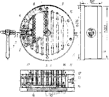 Если при расчете диаметр ролика d получается дробным, его округляют до меньшего целого числа и проводят повторный расчет х и радиуса Rz для принятого значения d: хRl сое аг, 92=tg аз -аг, где Q2 - полярный угол для принятого размера d: 62 = -iiga,-a,) + dl2R,-n/z. Определив величину полярного угла бз, находят угол а2 = а2 + у и подставляют в формулу для х. Затедт для принятого d получают R;=V{x sin a2-flf/2)2 + (/?;)2. Полученная величина R должна быть меньше Rb, для того чтобы точка касания ролика находилась на профиле зубьев колеса. § Vl.11. Магнитные и электромагнитные патроны Круглые патроны с постоянными магнитами. Такие патроны, применяют для установки и зажима деталей на токарных и шлифовальных станках. Закрепление обрабатываемых деталей в них происходит быстро. Базовые поверхности обрабатываемых деталей (колец, дисков) должны представлять собой плоскость с шерохо- ватостью поверхности (ГОСТ 2789-73). С уве- личением высоты гребешков на базовой поверхности детали сила ее зажима на патроне значительно снижается, так как увеличивается воздушный зазор, который создает большое сопротивление прохождению магнитного потока. Сила зажима при установке на патрон закаленных деталей больше, чем при установке незакаленных деталей. Магнитные патроны применяют при чистовом точении поверх-)юстей небольших деталей на токарных станках и при шлифовании наружных и внутренних поверхностей на шлифовальных станках. На рис. VL25, а показан патрои с постоянным магнитом и наружным диаметром 265 мм. Патрон имеет корпус 8 из силумина, верхнюю и н нижнюю 14 плиты. В корпусе размещается магнитный блок, состоящий из цплиндрических постоянных магнитов 6 и пластин 7 из лелеза Армко, залитых эпоксидным клеем. Магнитный блок смонтирован на промежуточной плите 16, на которой .чакреплепы крайние пластины 5 и 12 магнитного блока. В пластине 5 закреплена гайка 4 с внутренней трапецеидальной резьбой, а с гайкой связан винт 2, вращающийся в двух бронзовых втулках 3, установленных в корпусе патрона. Винт 2 имеет цилиндрический буртик, который не дает ему перемеш.аться в осевом направлении. При вращении торцовым ключом / гайка 4 с пластиной 5 и Магнитка ![]() ![]() Рис. VI.25, Патроны: а - магнитный; б - электромагнитный ным блоком перемещаются, а винт 2 не смещается в осевом направлении. На рис. VI.25, а показано включенное положение магнитного патрона; при этом пластины 7 магнитного блока совпадают со вставками 9 из железа Армко верхней плиты И. В этом положении патрона магнитный поток должен пройти через обрабатываемую деталь. Магнитный блок во включенном положении патрона фиксируется упором П, в который после перемещения магнитного блока упирается пластина 5. Для включения патрона ключом 1 вращают гайку 4 и перемещают магнитный блок на 4,25 мм, при этом крайняя пластина 12 блока прижимается к упору 18. Внутрь патрона через резьбовое отверстие с пробкой 13 заливают минеральное масло. Верхнюю и промежуточную 16 плиты изготовляют из железа Армко, а нижнюю 14 - из стали. Для точного размещения элементы магнитного блока перед заливкой эпоксидным клеем устанавливают на промежуточной плите 16 между медными штифтами 16. Симметричное размещение вставок из железа Армко относительно фасонных вырезок верхней плиты И достигается установкой с двух сторон штифтов 10 между вставками и стенками выфрезеро-вок. Зазор между вставками и стенками выфрез
