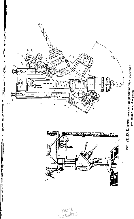 ![]() горец шпиндельной бабки и при дальнейшем подъеме головки пе-Рремещает вниз стержень 6, который нажимает на рычаг 4. Рычаг, поднимая муфту 3 и соответствующий рабочий шпиндель, перестает вращаться. Затем стержень 6 нажимает на рычаг 2 и поворачивает его на оси. При повороте рычаг 2 выводит фиксатор / из втулки. Во время дальнейшего подъема головки регулируемый болт 8 упирается в торец шпиндельной бабки и перемещает вниз стержень 9 с зубчатой рейкой. При этом рейка на стержне 9 вращает зубчатое колесо 10, которое через пару конических зубчатых колес и храповой механизм в свою очередь вращает зубчатое колесо 12 и находящееся с ним в зацеплении зубчатое колесо 13, которое поворачивает корпус 14 с соответствующим шпинделем в вертикальное рабочее положение. Шариковый фиксатор (на рис. VH.IS, б отсутствует) предварительно фиксирует поворот головки. При перемещении вниз револьверная головка работает в обратной последовательности и фиксатор / под действием пружины фиксирует точное положение очередного шпинделя при повороте головки. Корпус головки не может повернуться в обратную сторону, потому что храповой механизм проскакивает вхолостую. Пружина, установленная на шпинделе 15, включает зубчатую муфту 3 и шпиндель с режущим инструментом начинает вращаться и производит соответствующую обработку отверстия. Максимальный диаметр сверла, устанавливаемого в сменном шпинделе головки, 15 мм. Сменные шпиндели расположены под углом 30° к плоскости разъема корпусов 5 а 14 п под углом 60° - к оси вращения поворотного корпуса 14. § Vil.6. Расчет многошпиндельных сверлильных головок При расчете специальных многошпиндельных сверлильных головок необходимо иметь следующие исходные данные: 1) чертеж обрабатываемой детали с техническими условиями; 2) технологическую карту с процессом обработки детали, с элементами режима резания и штучного времени на каждую операцию; 3) наименование, размеры и материал режущих инструментов, а также форму и размеры их хвостовиков; 4) паспортные данные станка, для которого проектируют головку, и мощность электродвигателя станка; 5) максимально допустимую осевую силу на шпинделе станка (силу подачи); 6) величины подач и числа оборотов шпинделя станка; 7) форму и размеры нижней части шпинделя станка, которые связывают шпиндель с головкой; 8) вылет шпинделя от направляющих станины станка; 9) максимальный ход шпинделя станка; 10) величину вертикального перемещения стола станка; 11) чертеж приспособления для установки и зажима обрабатываемой детали с техническими условиями. Расчет многошпиндельных сверлильных головок производится в такой последовательности: 1) выбирают элементы режима резания по справочникам для каждого режущего инструмента и кор- ректируют их с паспортными данными станка; 2) определяют крутящие моменты, мощности и силы подачи для каждого режущего инструмента; 3) определяют мощности для привода головки; 4) определяют частоту вращения шпинделя станка; 5) определяют подачи шпинделя для привода головки; 6) определяют суммарную силу подачи от всех режущих инструментов; 7) выбирают кинематическую схему сверлильной головки; 8) рассчитывают размеры валиков, рабочих шпинделей и зубчатых колес головки; 9) корригируют зубчатые колеса; 10) рассчитывают и подбирают подшипники; И) подбирают узлы для ведущего и рабочих шпинделей, валов,