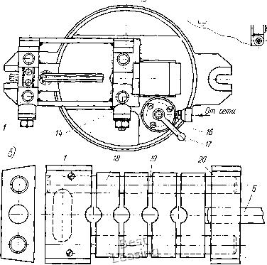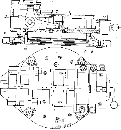 так как при этом на отверстия переносятся все неточности работы шпинделя сверлильного станка. Следовательно, для получения отверстий 2-2а-3-го классов точности развертки следует закреплять в самоустанавливагощихся патронах. Эти патроны бывают двух типов: качающиеся и плавающие. После закрепления в качающемся патроне развертка может при обработке отверстия поворачиваться на небольшой угол относительно вертикальной оси патрона, а в плавающем патроне-перемещаться на небольшую величину параллельно вертикальной оси, поэтому обеспечивается совпадение осей развертки и отверстия детали. В патронах обоих типов между отдельными деталями имеются конструктивные зазоры, которые позволяют развертке при обработке отверстия перемещаться параллельно своей вертикальной оси и поворачиваться на небольшой угол относительно этой оси. Вследствие этого между двумя типами самоустанавливающихся патронов нет большого различия. Для крепления разверток следует применять плавающие патроны, по конструкции схожие с конструкцией плавающих патронов для крепления метчиков. В табл. vn.l даны формулы для определения сил зажима деталей, обрабатываемых на сверлильных станках при различных схемах зажима. г л ж в А VIII ПРИСПОСОБЛЕНИЯ ДЛЯ ФРЕЗЕРНЫХ СТАНКОВ Приспособления для фрезерных станков по виду подачи стола разделяют на приспособления к станкам с прямолинейной, круговой и сложной копирной подачей. По степени совмещения вспомогательного времени с основным эти приспособления подразделяют на две группы: 1) приспособления, в которых при обработке деталей вспомогательное время совмещается с основным; 2) приспособления, у которых при обработке деталей это время не совмещается. Приспособления для фрезерных станков бывают универсальными, универсально-сборными, универсально-наладочными, групповыми и специальными. По данным ЭНИМСа, основное время, затрачиваемое при обработке деталей на фрезерных станках, в различных типах производства составляет 50-80% штучного времени. Большие резервы для повышения производительности труда при обработке деталей на фрезерных станках выявляют при замене старых конструкций приспособлений с ручным зажимом новыми приспособлениями с механизированным приводом для зажима и разжима обрабатываемых деталей. § VIII. 1. Машинные тиски Машинные тиски являются универсальным приспособлением, их применяют для обработки различных по форме и размерам деталей. Тиски имеют постоянные детали (корпус, салазки, механизм зажима) и сменные губки, которые используют при обработке раз- личных типоразмеров деталей. Тиски бывают с одной или двумя подвижными губками, с плавающими губками. В тисках применяют зажимы: ручные, винтовые, эксцентриковые, механизированные, пневматические, гидравлические, пневмогидравлические. В зависимости от направления силы зажима, действующей на подвижную губку, тиски бывают с тянущей или толкающей силой зажима. Тиски изготовляют неповоротными, поворотными в одной плоскости, поворотными в двух взаимно перпендикулярных плоскостях. По ГОСТ 14904-69 станочные тиски изготовляют трех типов: А - с ручным приводом, Б - с гидроприводом, В - с пневмоприводом. Конструкции станочных тисков должны быть жесткими, быстродействующими и удобными в работе. На рис. VIII.1 показаны универсальные само-центрнрующне тиски с двумя пост
