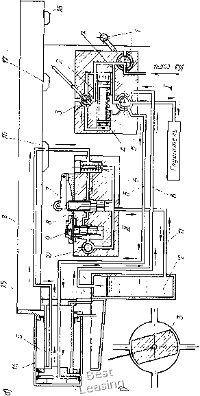 ![]() е- 3 н о « о. а" се со я « S о « а к f- га о н S о о а, m о к с <и X при открытии пускового крана / сжатый воздух из сети через распределительный золотник 5 по трубе б поступает в левую полость А пневмогидравлического цилиндра 14 и производит ускоренное перемещение цилиндра влево вместе со столом 15 станка, с которым он жестко скреплен, а поршень 13 и его шток закреплены на неподвижной части станка и не перемещаются. При перемещении цилиндра 14 влево масло, находящееся в правой его полости Б, выдавливается через трубку г, открытый клапан 5 гидравлической коробки и трубку 11 в бачок 12. Этот период цикла соответствует быстрому подводу стола с приспособлением и обрабатываемой деталью к "фрезе. Во время дальнейшего перемещения стола упор 16, закрепленный в его боковом пазу, нажмет на ролик рычага 7, который переместит клапан 5 вниз, и подача масла в трубку 11 прекратится. При этом масло, вытесняемое из правой полости Б цилиндра 74, проходит через редукционный клапан 9, дроссель 10 и по трубке 11 поступает в бачок 12. Дроссель 10 уменьшает количество масла, проходящего в сети в единицу времени, поэтому скорость перемещения стола замедляется и происходит обработка детали. Редукционный клапан 9 обеспечивает постоянное давление перед дросселем 10 для получения постоянной рабочей подачи при изменении сил резания в процессе обработки детали на станке. Упоры 17 и 18, закрепленные на столе станка, поворачивая рукоятку вспомогательного золотника 3, автоматически переключают распределительный золотник 5 и изменяют направление движения стола с деталью в процессе ее обработки. В конце рабочего хода стола упор /5 поворачивает рукоятку вспомогательного золотника 3, ири этом поршень 2 вспомогательного цилиндра, перемещаясь вправо, переключает основной золотник 5, и сжатый воздух из сети по трубопроводу в поступает в верхнюю часть бачка Под давлением сжатого воздуха масло вытесняется из бачка, по трубке И через обратный клапан 6 и трубку г поступает в правую полость Б цилиндра 14 и быстро перемещает цилиндр 14 со столом и обработанной деталью вправо. При этом находящийся в левой полости А цилиндра 14 воздух через трубку б, золотник 5 и глушитель уходит в атмосферу. При иеремещении стола станка вправо в конечном положении уиор 17 повернет рукоятку вспомогательного золотника 3 и цикл движения стола повторится в описанной последовательности. Вспомогательный золотник 3 обеспечивает мгновенное переключение основного распределительного золотника 5. При мертвом положении вспомогательного золотника 3 (рис. VHI.IS, б) воздух из сети поступает в золотник 5 по каналу а и затем по трубке б в цилиндр, поэтому рабочая подача стола станка продолжается. Когда золотник 3 пройдет вертикальное положение, воздух из сети мгновенно переместит поршень 2 вправо и повернет золотник 5, связанный зубчатым колесом 4 с поршнем 2. При этом воздух из цилиндра 14 выходит в атмосферу, воздух из сети - в резервуар 12, а стол 15 быстро перемещается вправо. Затем упор 17 снова переключает золотники 5 и i, и цикл работы станка повторяется. Расчет сил зажима при обработке деталей на фрезерных станках Схема зажима ![]() ![]() Гасчетные формулы стола зажима, Н (кгс) aP + bf + г Wq = win W = sm(al2)Yp\ + Pl + Pl W--сила зажима детали, Н (кгс); Ри Рг, Рз - составляющие силы резания, Н (еп) f - коэффициент трения на рабочих поверхностях зажимов (для гладких повер