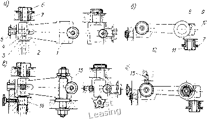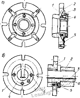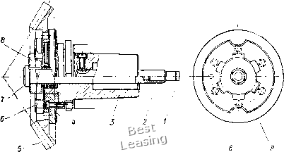 Поочередная подача сжатого воздуха в полости пневмоцилиндра производится при переключении золотника распределительного крана. От распределительного крана сжатый воздух по трубопроводу подается к воздухоприемнику и затем в одну из полостей пневмоцилиндра. Во втулке 15, запрессованной в корпусе 12 воздухоприемнпка, расположен на шарикоподшипниках невращающийся воздухораспределитель 13, закрепленный на воздухоподводяшен трубе 14, которая жестко связана с неподвижной частью станка. После установки пакета зубчатых колес на приспособление кладут быстросъемную шайбу 7. Далее переключают распределительный кран на зажим, сжатый воздух от него по трубопроводу 14 и каналам воздухораспределителя 13 через трубу 10 поступает в верхнюю полость пневмоцилиндра и перемешает поршень 2 со штоком 3 вниз. Закрепленная на штоке гайка 5 сжимает пружину 4, которая перемещает плавающую втулку 8 с клиньями 9 вниз. 1"7ри этом клинья раздвигаются и окончательно центрируют обрабатываемые детали. Во время дальнейшего опускания поршня 2 вниз шток 3 гайками на его верхнем конце прижимает шайбу 7 к деталям и они закрепляются. После нарезания зубьев на колесах распределительный кран переключается на разжим и сжатый воздух от распределительного крана через воздухораспределитель 13 по трубопроводу поступает в нижнюю полость пневмоцилиндра. При этом сжатый воздух перемещает поршень 2 со штоком 3 вверх. В начале перемещения вверх штока гайки на его верхнем конце отходят от шайбы 7, а при дальнейшем подъеме цилиндрический выступ штока упирается в нижний торец плавающей втулки 8. Клинья 9, перемещаясь в Т-образных пазах втулки 8, сдвигаются к центру, обрабатываемые детали освобождаются от зажима и центрирования, затем снимают шайбу 7 и обрабатываемые детали. Далее рабочий устанавливает в ириспособление следующий пакет деталей, ставит шайбу 7, производит соответствующее переключение распределительного крана, и цикл обработки деталей повторяется. Приспособление применяют в крупносерийном и массовом типах производства. На рис. IX.3 показано приспособление для установки и зажима конических колес при нарезании зубьев на зуборезном станке. Обрабатываехмое колесо 5 центральньнм базовььм отверстиехм устанавливают на шейку сменного фланца 4 оиравки 3. Зажим и разжим детали производятся при соответствующем перемещении поршня со штоком в пневмоцилиндре. Шток пневмоцилиндра через тягу / жестко соединен с валиком 2. При иодаче сжатого воздуха в штоковую полость пневмоцилиндра поршень со штоком, тягой / и валиком 2 перемещаются вправо. Валик нажимает головкой 7 на две шайбы б и 8, и колесо зажимается между фланцем 4 оиравки и съемной шайбой 6. При подаче сжатого воздуха в бесштоковую полость пневмоцилиндра (на рис. IX.3 пневмоцилиндр отсутствует) поршень со штоком, тягой / и валиком 2 перемещается влево. Головка валика отходит от шайб, И обработанное колесо разжимается. Чтобы снять шайбу 6, установленную в выемке зубчатого колеса, ее поворачивают до совмещения трех выемок с соответствующими выступами шайбы 8 и снимают. Затем снимают коническое колесо с нарезанными зубьями, устанавливают следующее колесо, ставят шайбу 6, зажимаю деталь и цикл обработки повторяется. ![]() Рис. IX. 3. Приспособление с пневмоприводом для нарезания зубьев конических колес иа зуборезном станке § 1Х.2. Прис