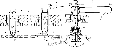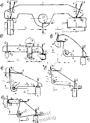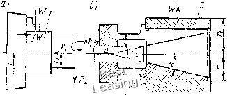 где /(=1,4-2,6 -коэффициент запаса; Л1рез -момент от силы резания Рг; / - коэффициент трения между поверхностями детали и кулачков (зависит от вида поверхности кулачков); г -радиус обрабатываемой части детали, зажатой кулачками, мм; ri -радиус обработанной части детали, мм. Тогда сила зажима деталей одним кулачком патрона [Н(кгс) где Z - число кулачков патрона. Величину WcyM проверяют на возможность продольного сдвига обрабатываемой детали силой по формуле ![]() Рнс. 111.2. Различные варианты, взаимодействия сил резания и сил зажима на деталь, установленную в патроне (а) и на цанговой оправке (б) откуда Десятый вариант (рис. III.2, б). Рассмотрим действие си-лы резания Рг на обрабатываемую втулку 2, установленную и зажатую на цанговой оправке / (рис. III.2, б). Сила Рг при обработке втулки 2 создает момент резания Л1рез, которому противодействует момент от силы трения Л1тр между установочной поверхностью цанги и обрабатываемой деталью. Суммарная сила зажима WcyM обрабатываемой детали всеми лепестками цанги откуда Момент от силы трения где / - коэффициент трения между деталью и цангой. Фактические силы зажима детали, создаваемые зажимными механизмами, должны равняться расчетным силам зажима или быть несколько больше их. Величина фактических сил зажима детали зависит от величины исходной силы Q, привода передаточного отношения между фактической силой зажима детали и исходной силой Q для конкретного зажимного устройства приспособления. Зависимость между силами и Q определяется равенством откуда где 1с - передаточное отношение между силами; Q - исходная сила, развиваемая рабочим или механизированным приводом, Н (кгс); ф - фактическая сила залсима обрабатываемой детали, Н. § III.2. Зажимные устройства приспособлений Зажимные устройства приспособлений служат для зажима (закрепления) и разлсима (раскрепления) деталей, обрабатываемых на станках. Эти устройства не должны изменять положение детали в приспособлении при ее закреплении и допускать ее смещение при обработке на станке. Зажимные устройства приспособлений разделяются на простые (элементарные) и комбинированные, т. е. состоящие из нескольких простых. Простые зажимные устройства (зажимы) состоят из одного элементарного зажима; они бывают клиновые, винтовые, эксцентриковые, рычажные и т. д. Комбинированные зажимные устройства состоят из нескольких простых устройств, соединенных вместе. Их изготовляют винто-эксцентрико-рычалсными и др. В зависимости от числа ведомых звеньев зажимные устройства разделяют на одно- и многозвенные. Любое зажимное устройство приспособления включает ведущее звено, на которое действуют исходная сила и несколько ведомых звеньев, кулачков или прихватов, непосредственно зажимающих детали. Многозвенные зажимные устройства зажимают одну деталь одновременно в нескольких местах или несколько деталей одновременно в многоместном приспособлении. В зависимости от источника силы, требуемой для зажима детали, зажимные устройства разделяются на ручные, механизированные и автоматизированные. Ручные зажимные устройства приводит в действие непосредственно рабочий за счет мускульной силы. Механизированные зажимные устройства работают от пневматического, гидравлического или другого привода. Автоматизированные устройства перемещаются от движущихся узлов станка, шпинделя, суппорта 